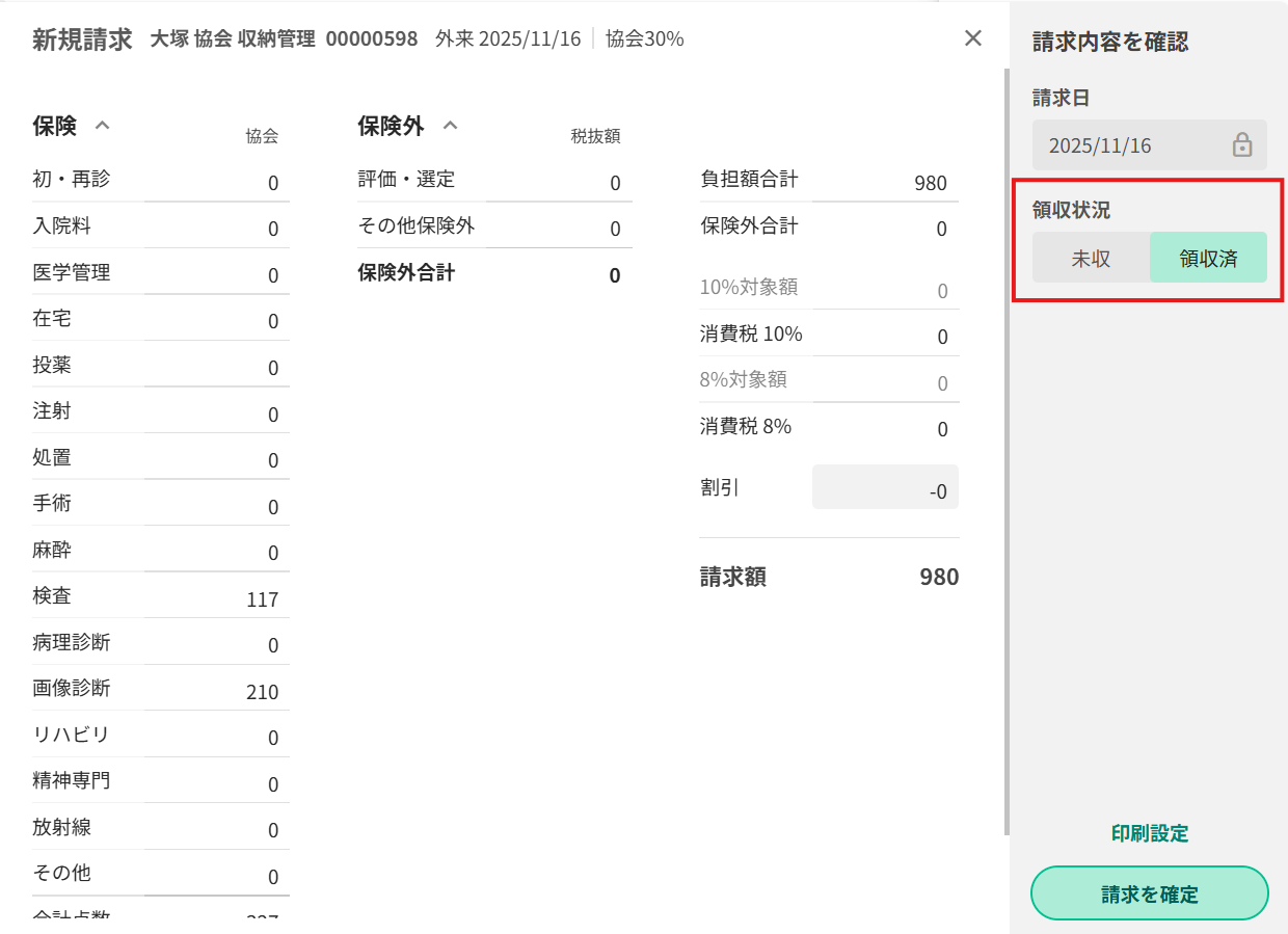 請求内容を確認・ 確定する画面(請求・領収画面)が開くので、会計画面で作成した請求内容を確認します