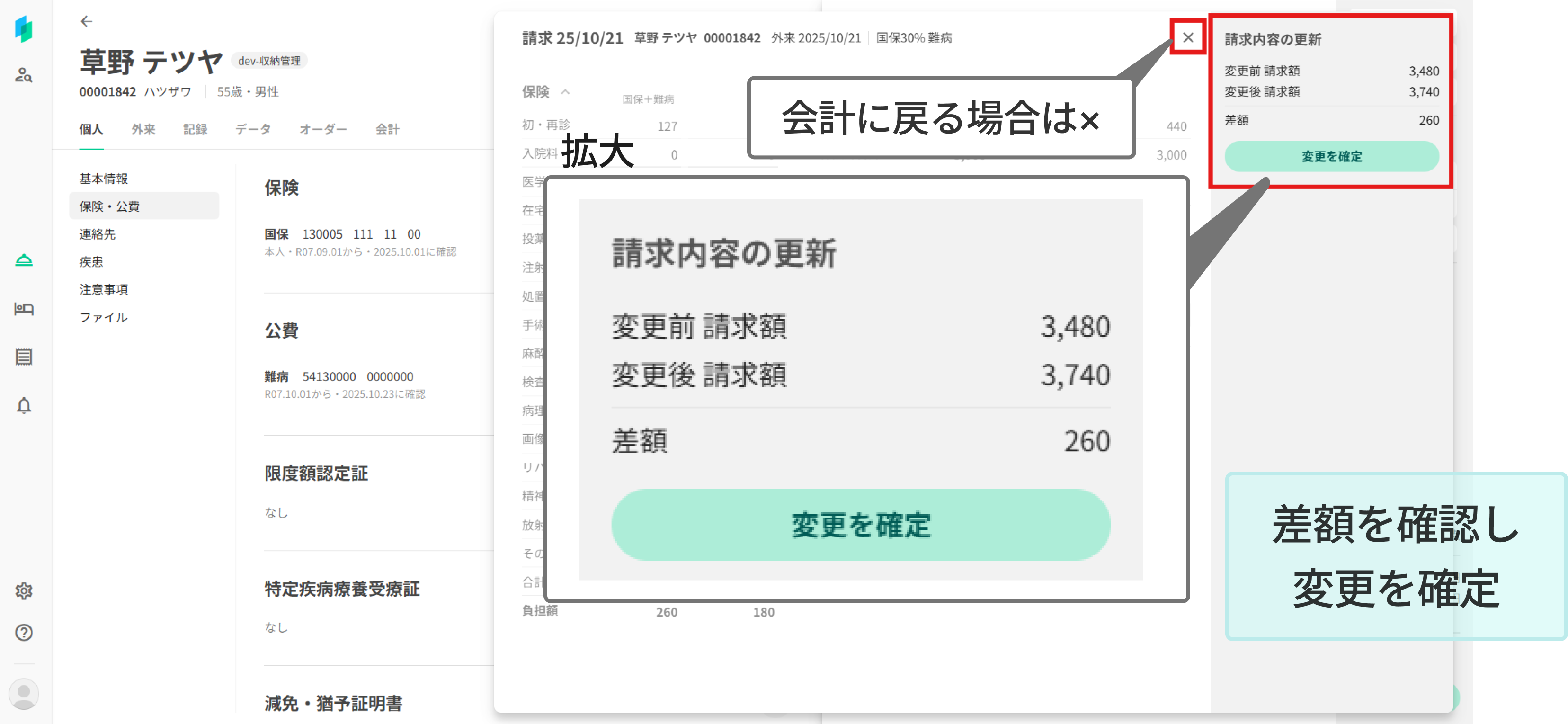 一度請求を作成した後に会計を編集すると請求内容が変更されます。請求ウィンドウに「請求内容の更新」が表示され、変更前/変更後の請求額と、変更による差額が表示されます。問題なければ「変更を確定」を押下し請求を再確定します。会計内容を再編集したい場合は、×ボタンで会計画面に戻ってください。