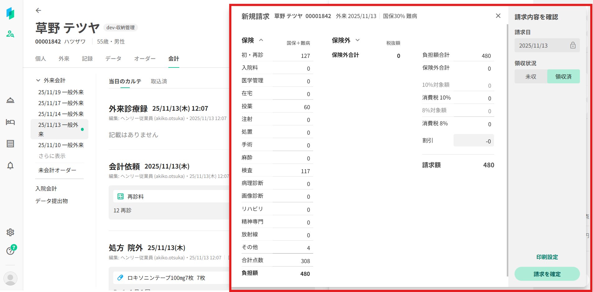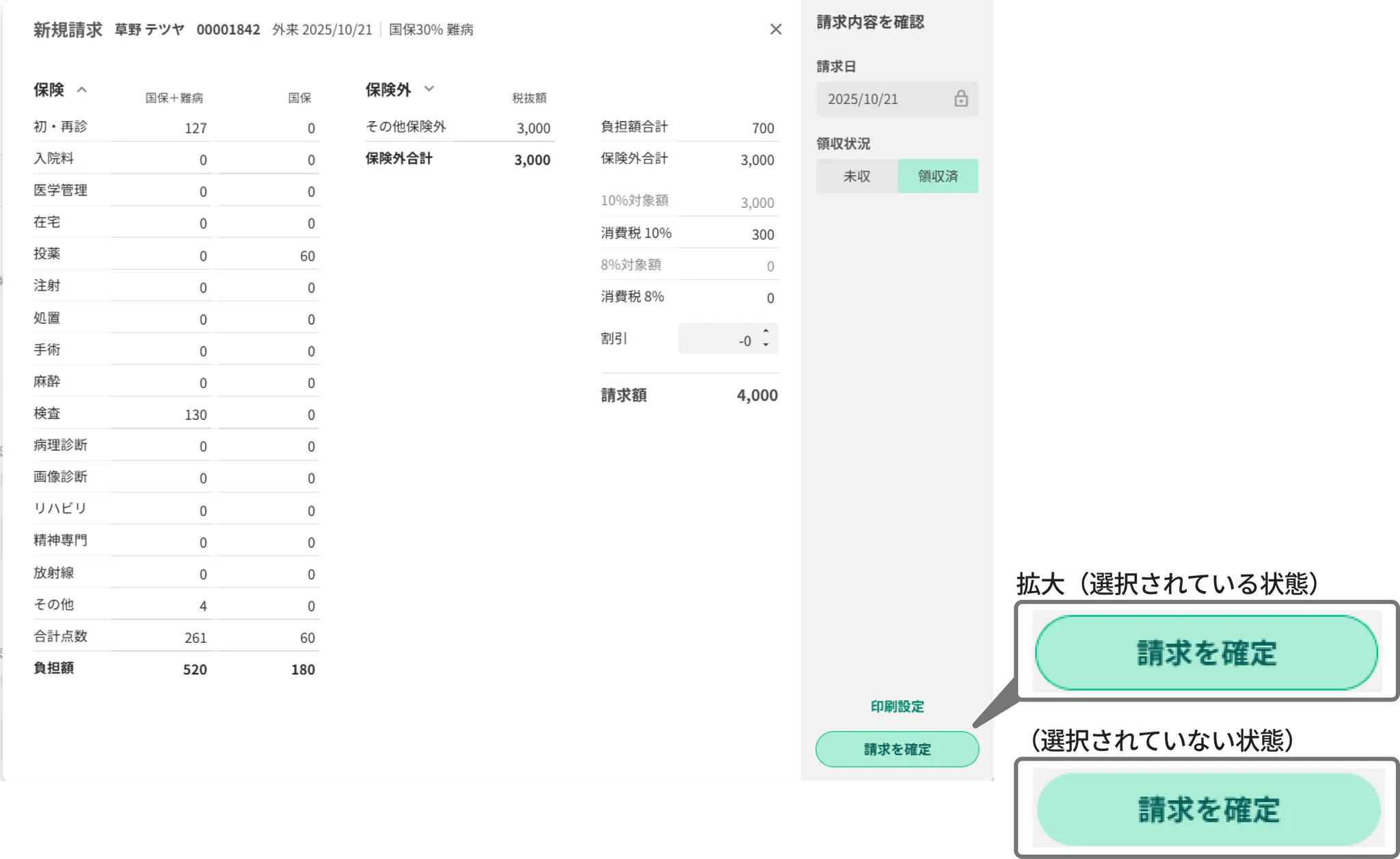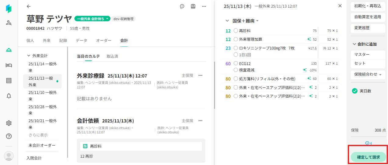 会計画面で会計内容を編集後、「確定して請求」ボタンを押下します