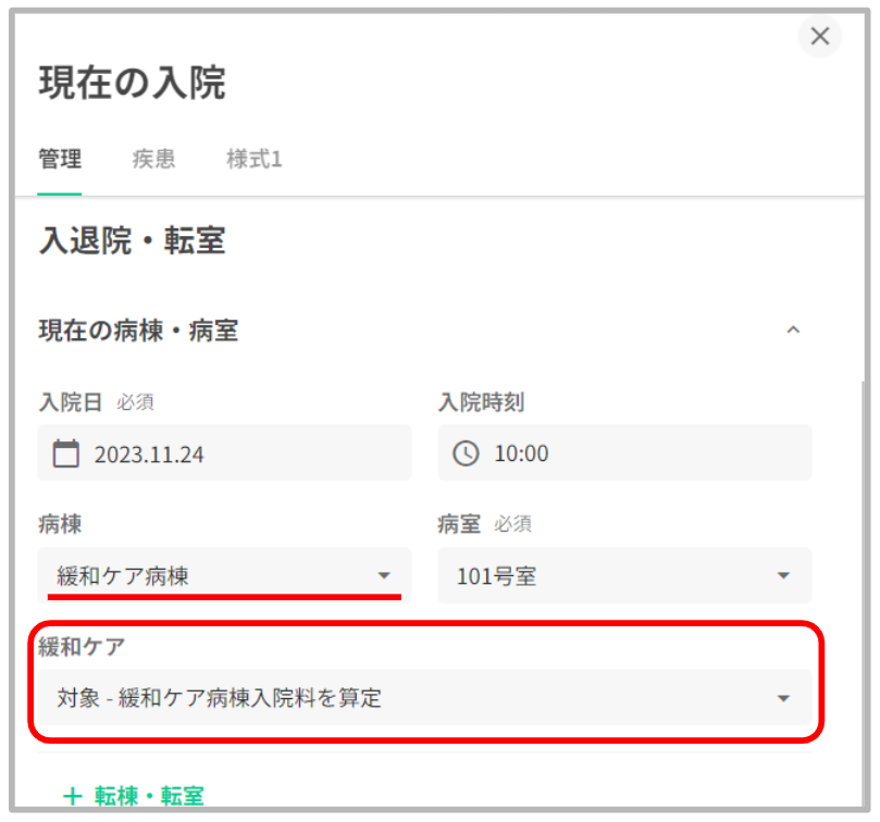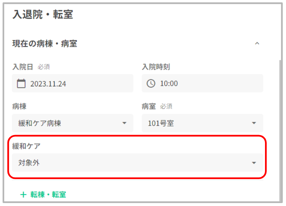 入院病棟に緩和ケア対象病棟が選択されている場合、入院患者情報画面に緩和ケア病棟入院料の「対象/対象外」を設定する入力欄が表示されます。