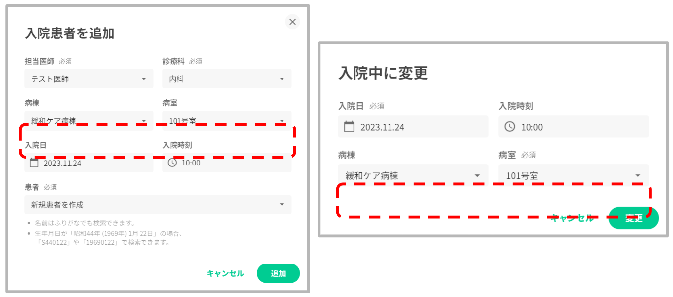 入院患者の追加画面や、入院中への変更画面では「対象/対象外」の設定画面は表示されませんのでご留意ください。「対象/対象外」の設定は入院患者情報画面よりお願い申し上げます。