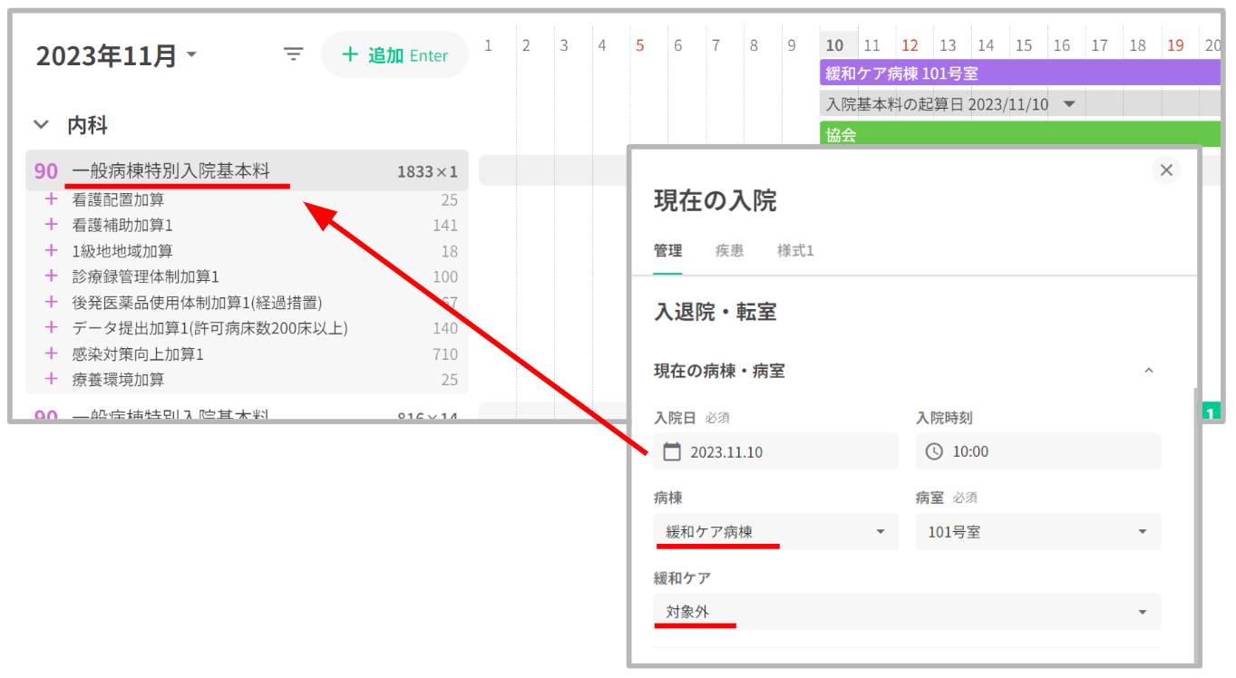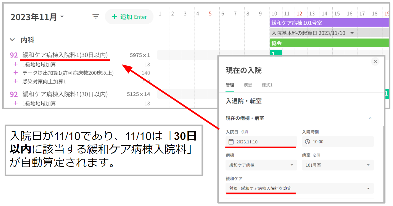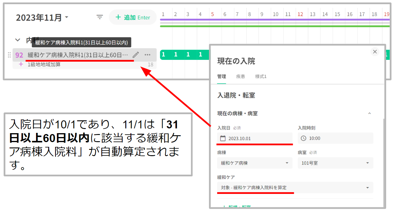 緩和ケア対象病棟に入院しており、緩和ケア欄で「対象-緩和ケア病棟入院料を算定」が設定されている場合、入院日数に応じた緩和ケア病棟入院料を自動算定いたします。