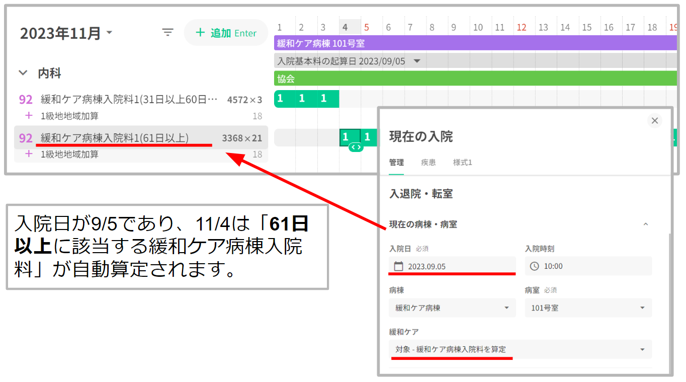 入院日数は入院期間初日を1日目として計算いたします。そのため、コスカレの入院起算日を変更した場合、緩和ケア病棟入院料の自動算定内容が異なる場合がありますのでご留意ください。