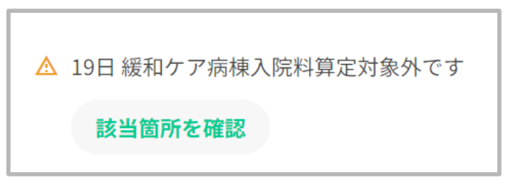 緩和ケア対象外病棟に入院している患者や「対象/対象外」欄で「対象外」を選択した患者に対して算定されている場合、算定対象外であることを示す警告メッセージを表示いたします。
