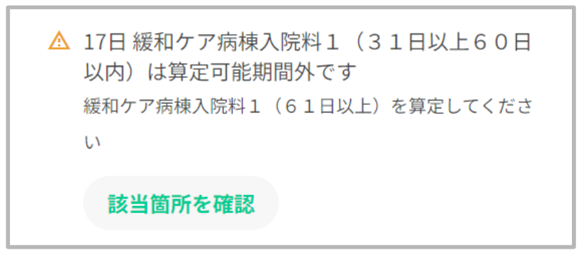 入院日数と異なる緩和ケア病棟入院料が算定されている場合、算定可能期間外であることを示す警告メッセージを表示いたします。