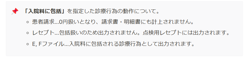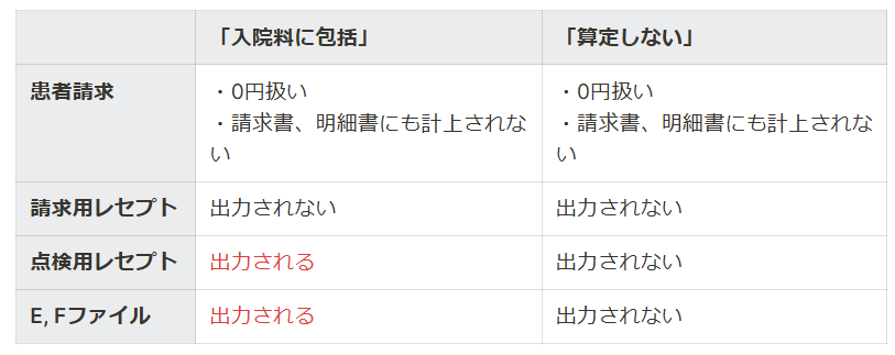 「入院料に包括」と「算定しない」の動作の違いは下記の通りです