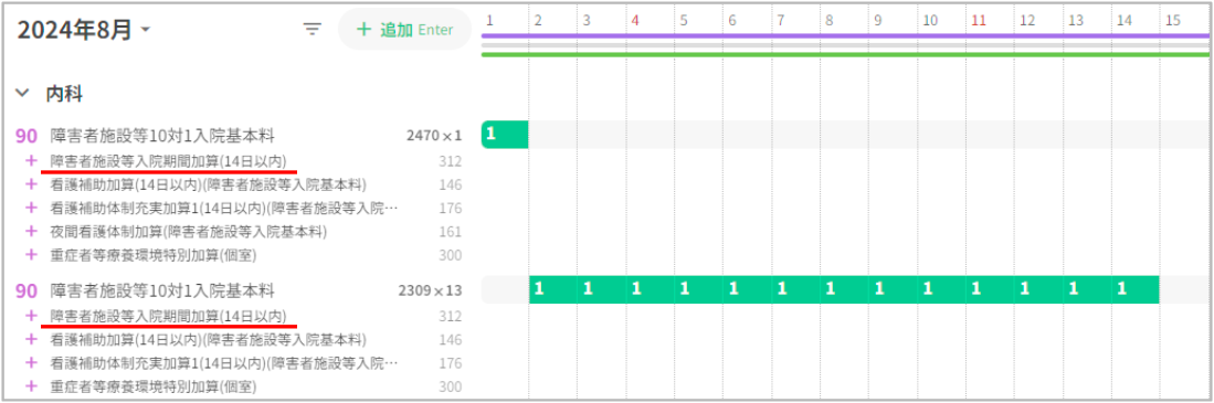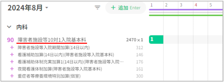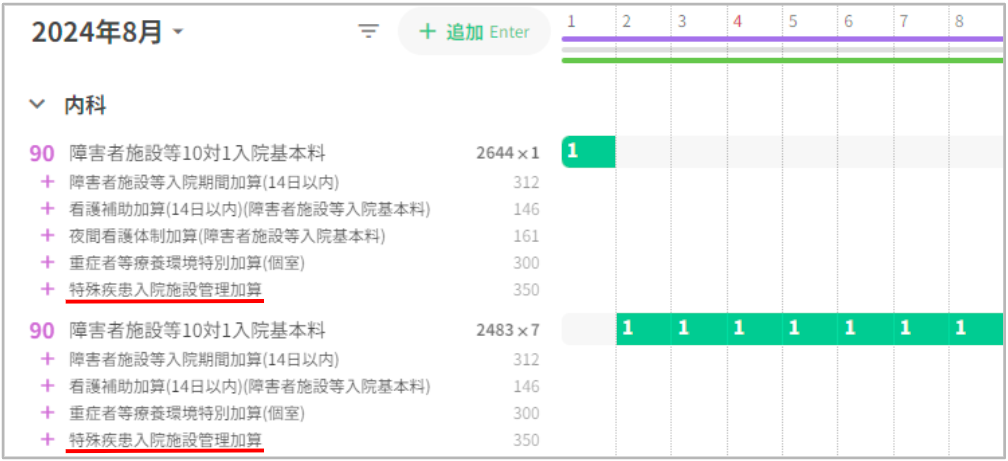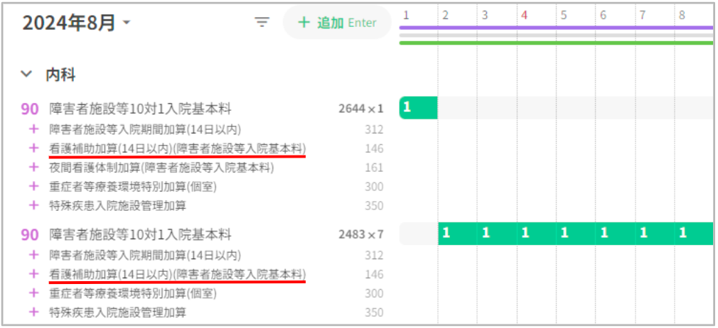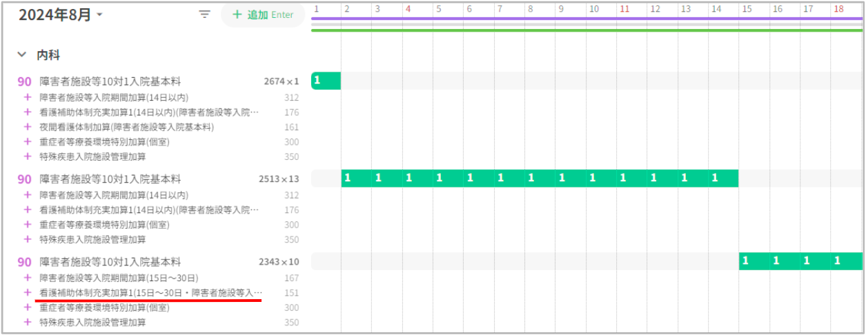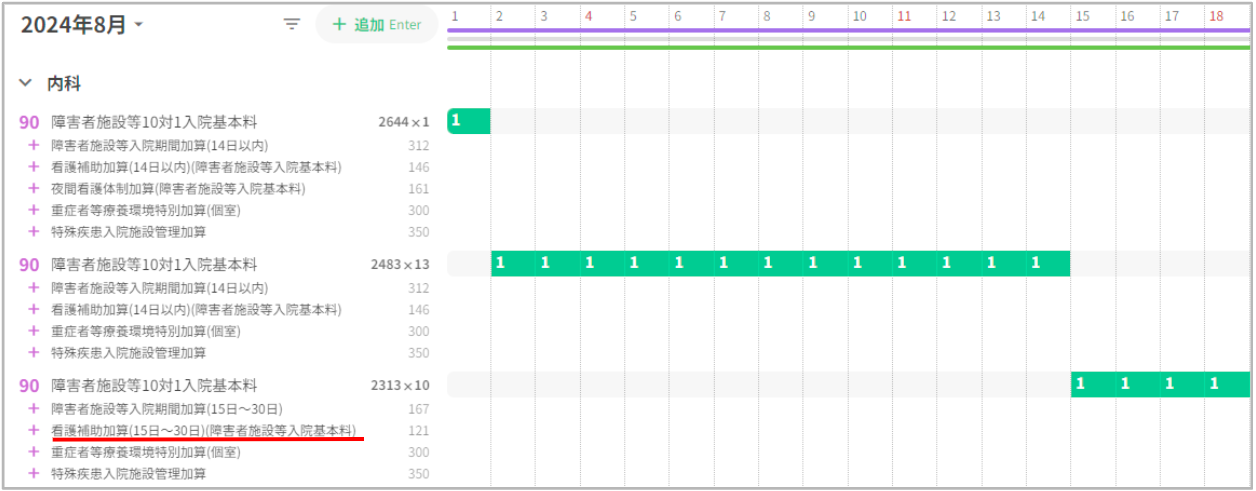 障害者施設等入院基本料の算定対象患者に対して、入院日数に応じた看護補助加算(障害者施設等入院基本料)を自動算定いたします。