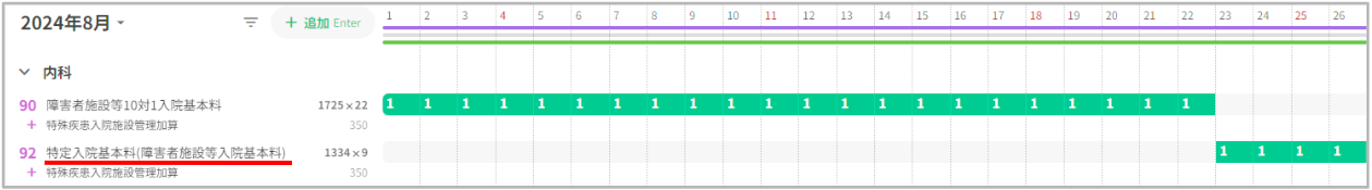 入院日が2024/5/25の場合、91日目の2024/8/23から「特定入院基本料(障害者施設等入院基本料)」を自動算定する