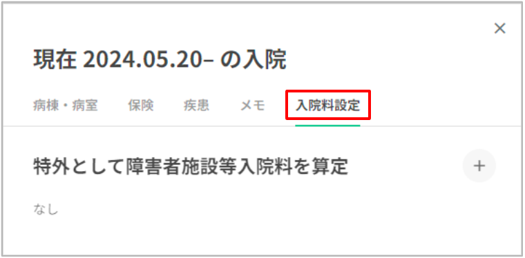 今回対応する障害者施設等入院基本料及び関連加算の自動算定、また後述の入院料設定画面の登録を行うには別途設定が必要となります。詳細につきましては、担当者までお問い合わせください。