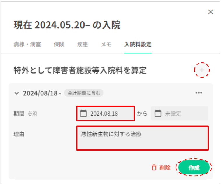 「+」を押下し、特外期間と特外の理由を入力して「作成」を押下する