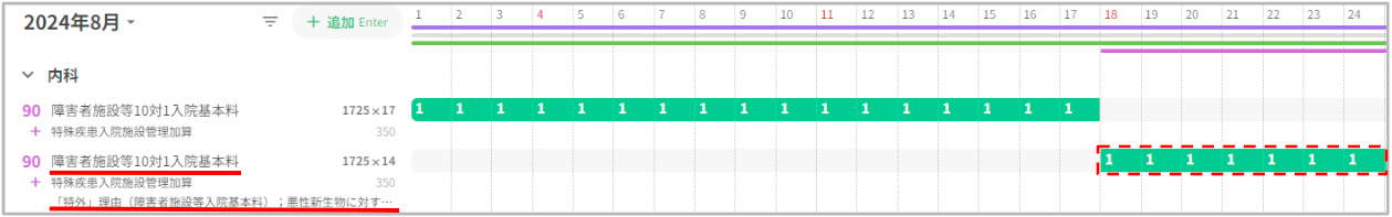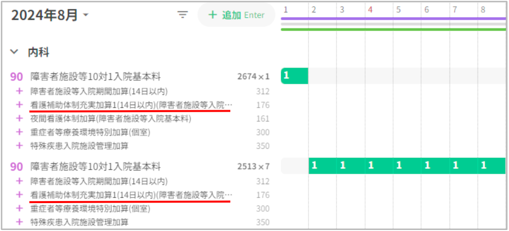 障害者施設等入院基本料の算定対象患者に対して、入院日数に応じた看護補助体制充実加算(障害者施設等入院基本料)を自動算定いたします。
