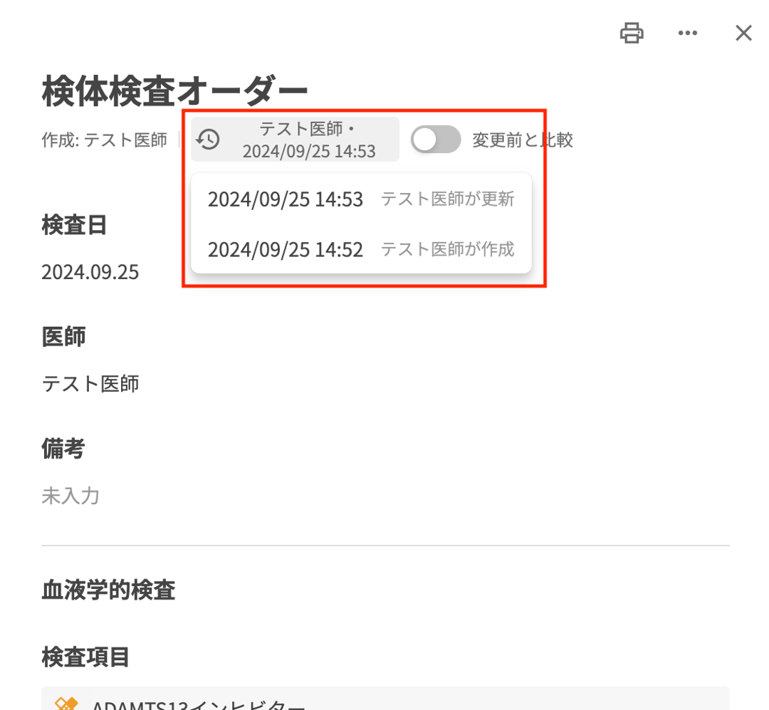 オーダー詳細画面上部の、最終更新者を押下すると履歴の一覧が表示され、選択すると過去の状態のオーダーが表示されます。