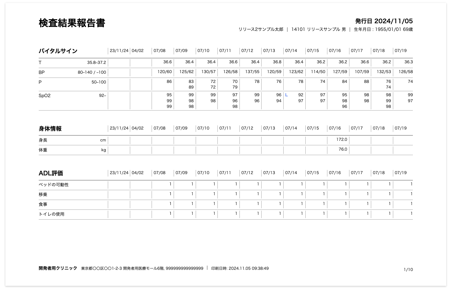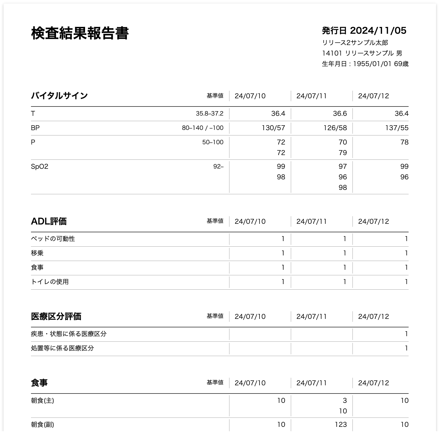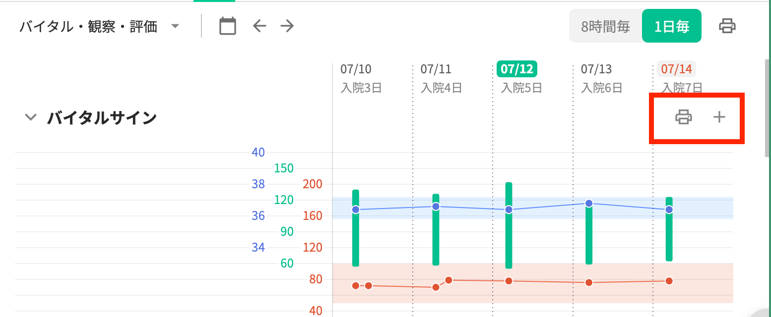 今まで最大3日間までの印刷に対応していましたが、バイタルサインなどの一定期間まとめての経過観察が必要な記録の印刷に対応するため、14日間まで印刷でできるよう改善しました。