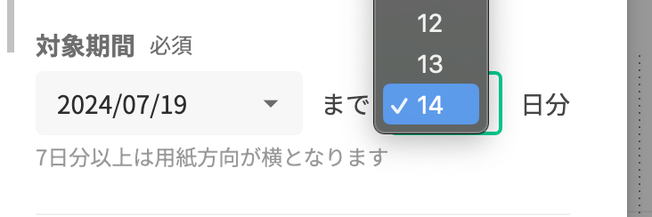 7日以上の日数を選択すると印刷用紙が横向きで印刷されます。