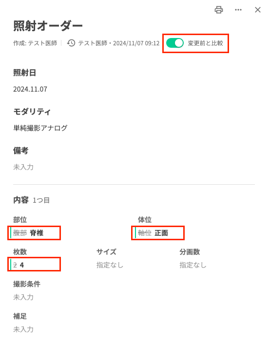 オーダー詳細画面で「変更前と比較」を有効にした状態で印刷すると、過去のオーダーと比較することが出来ます。