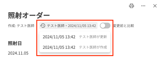 オーダー詳細画面上部の、最終更新者を押下すると履歴の一覧が表示され、選択すると過去の状態のオーダーが表示されます。