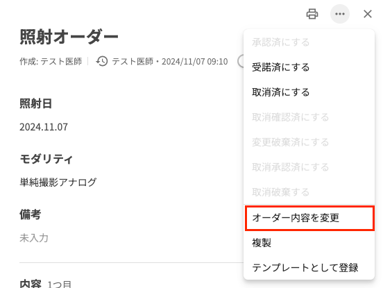 照射オーダーの変更・取消は、オーダーのステータスや職種に関わらずいつでも行うことが可能になります。