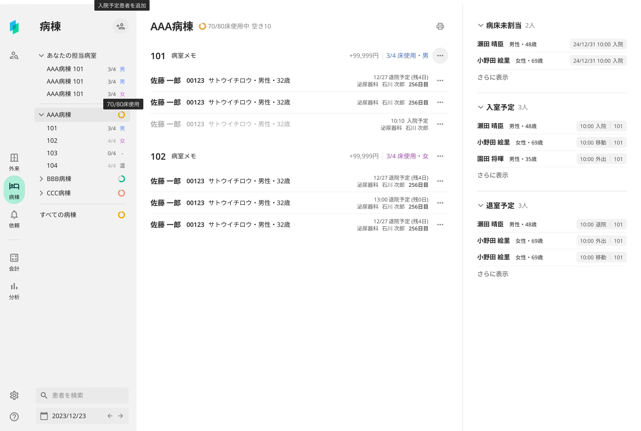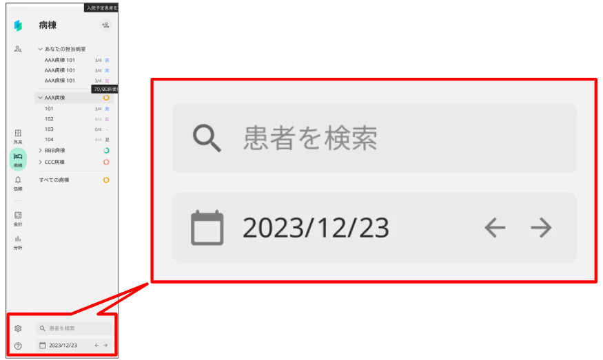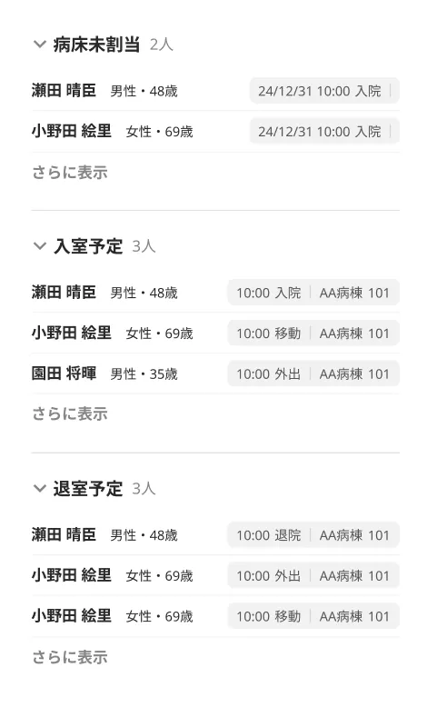 画面右側に入院/移動/退院予定の患者を表示します