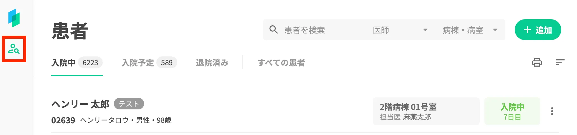 ※従来の「患者」画面も左上のアイコンから使用可能です。本画面は外来でも使用する画面のため、「すべての患者」が初期選択される仕様に変更します。