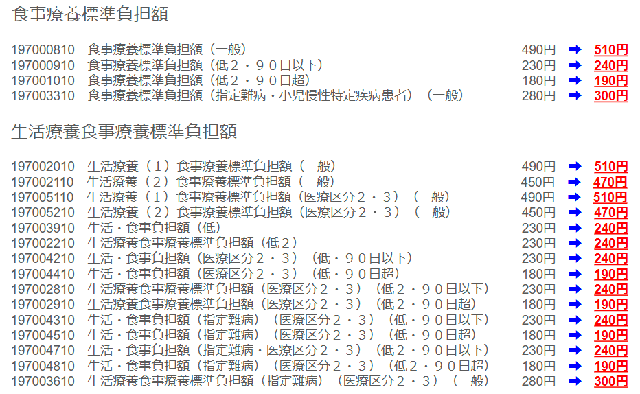※食事療養標準負担額及び生活療養標準負担額の金額変更一覧