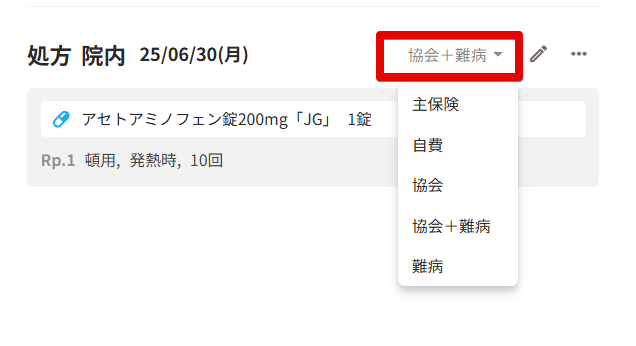 処方オーダーに登録した保険情報を処方箋に反映するので、特に処方の場合はご留意ください