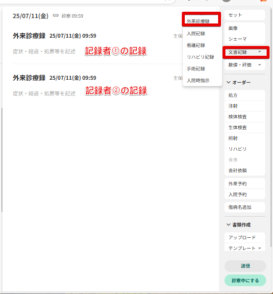 想定される状況医師、看護師など職種を分けて外来診療録を記載したい保険診療の記載と保険外診療を分けて外来診療録を記載したい対処方法外来診療録を開きますアクションパネルの文書記録より外来診療録を選択します新たに外来診療録が作成されます
