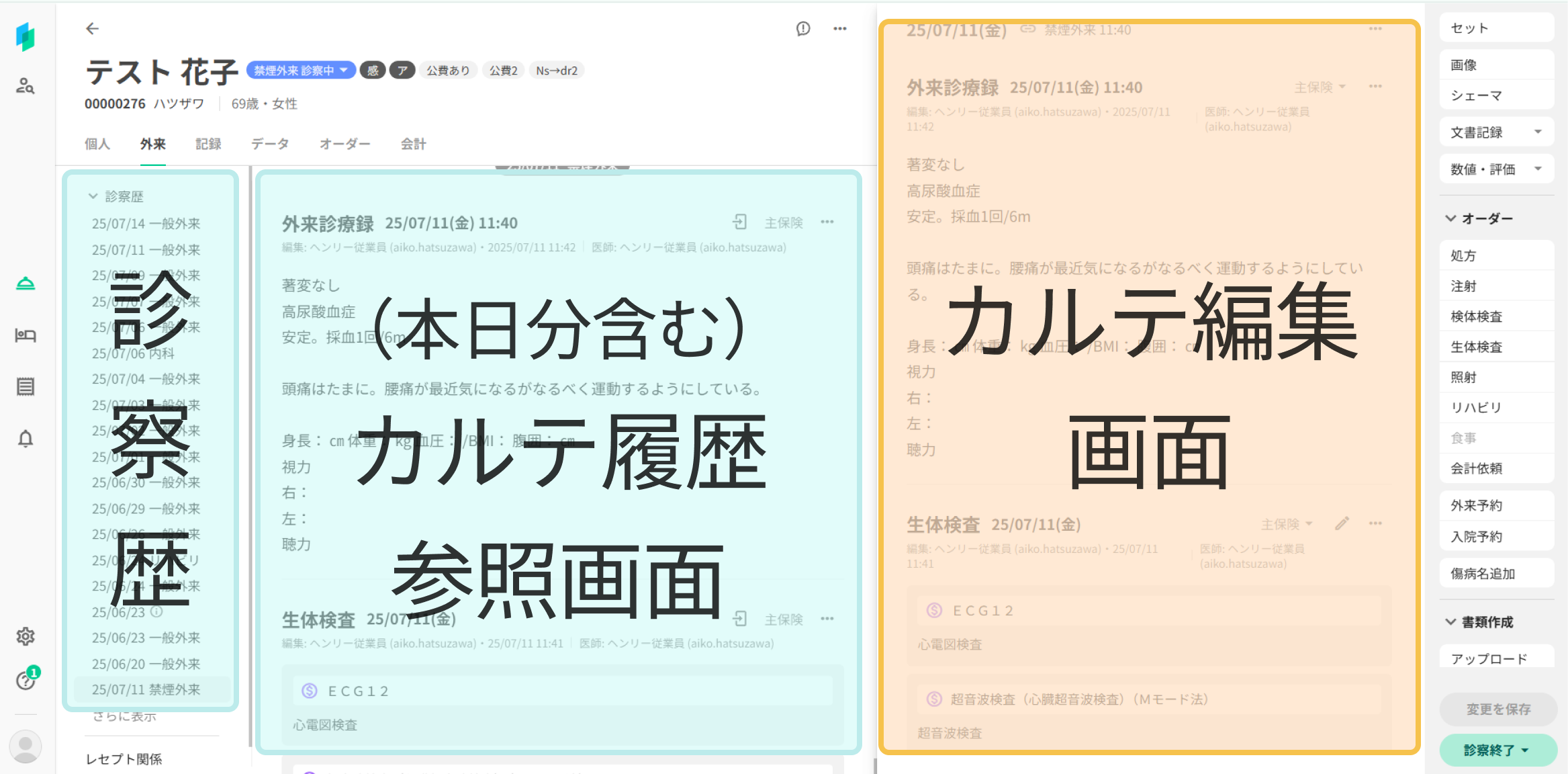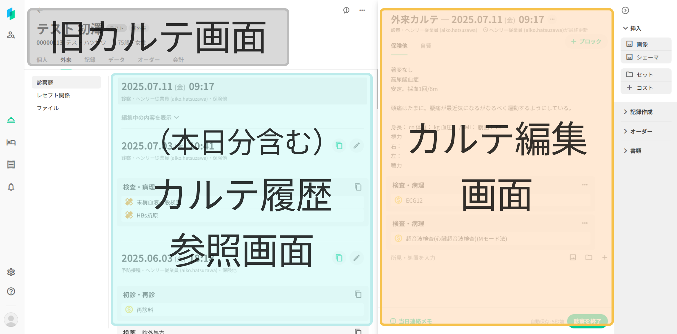 画面左側に診察歴(日付)と、本日分を含むカルテ内容が表示されます。