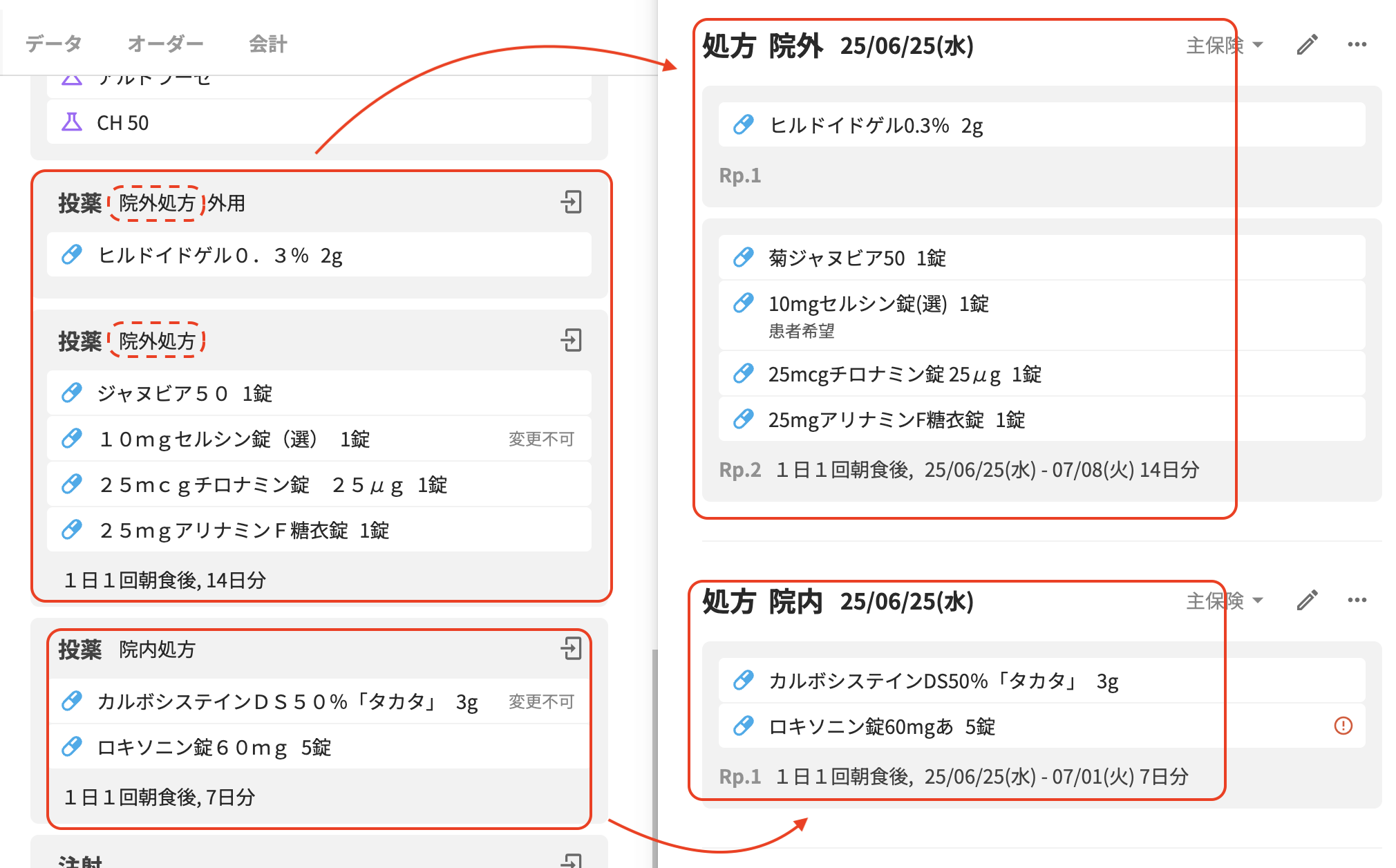 例)複数の処方や注射のコストブロックが混在する場合、処方は処方、注射は注射のオーダーとして、それぞれがひとつのオーダーとしてまとまります