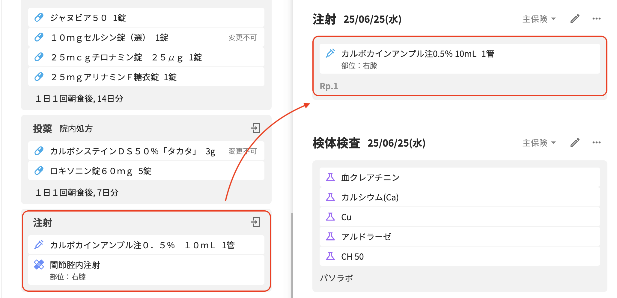 診療歴より転記(Do)したいオーダーを確認します