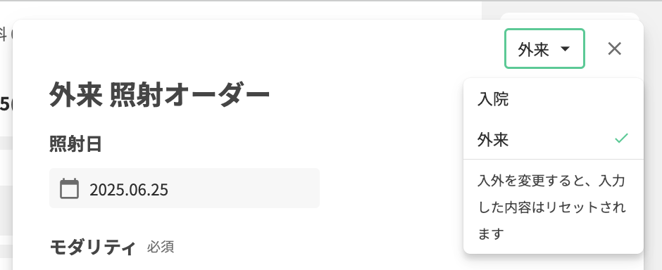 照射オーダーを入院→外来に変更する