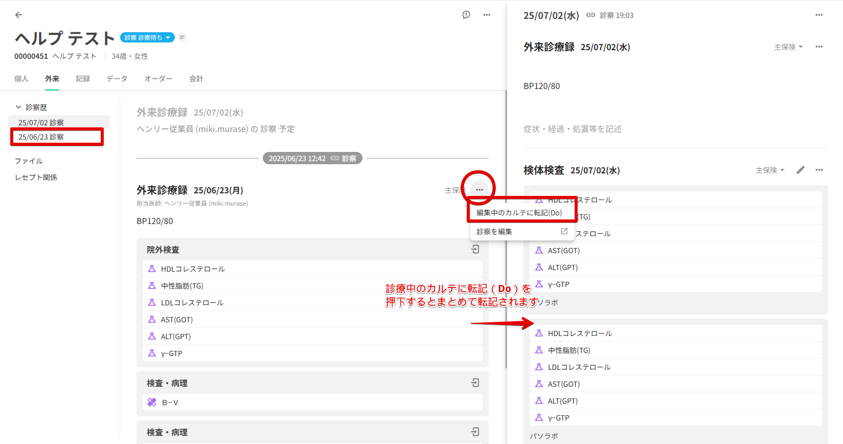 外来診療録の右側にある三点リーダーから[編集中のカルテに転記(Do)]を選択します