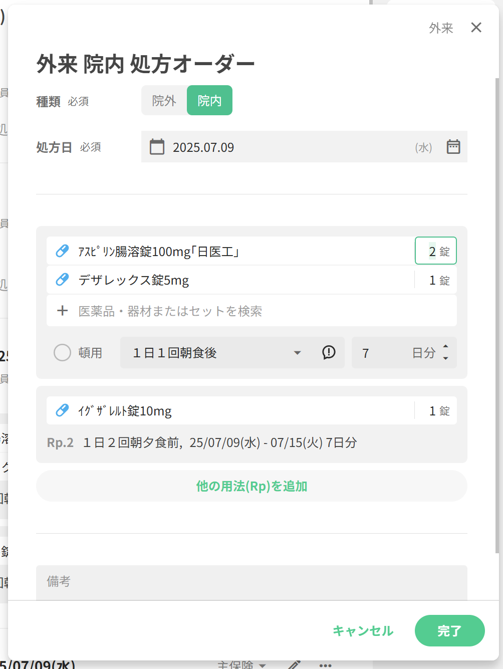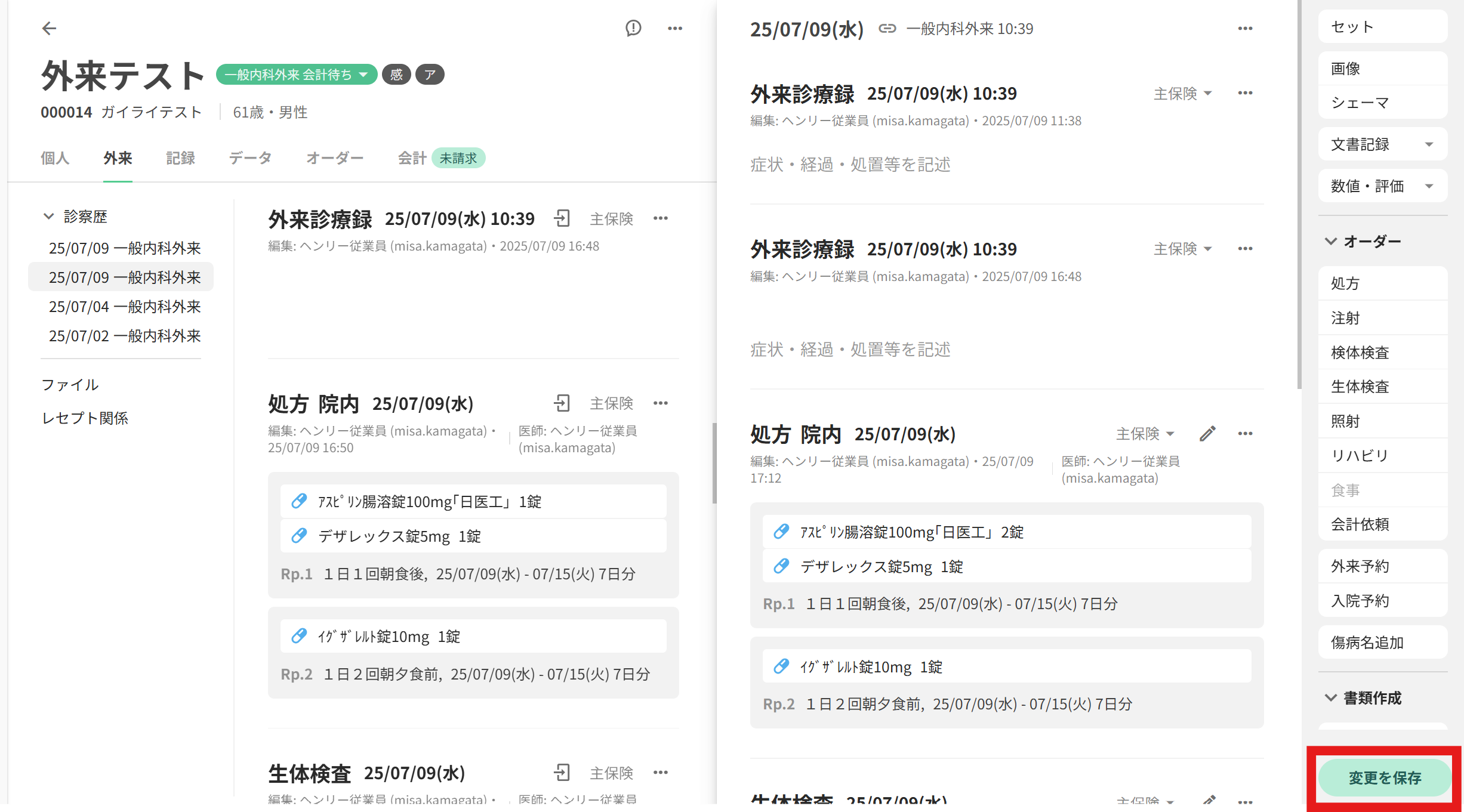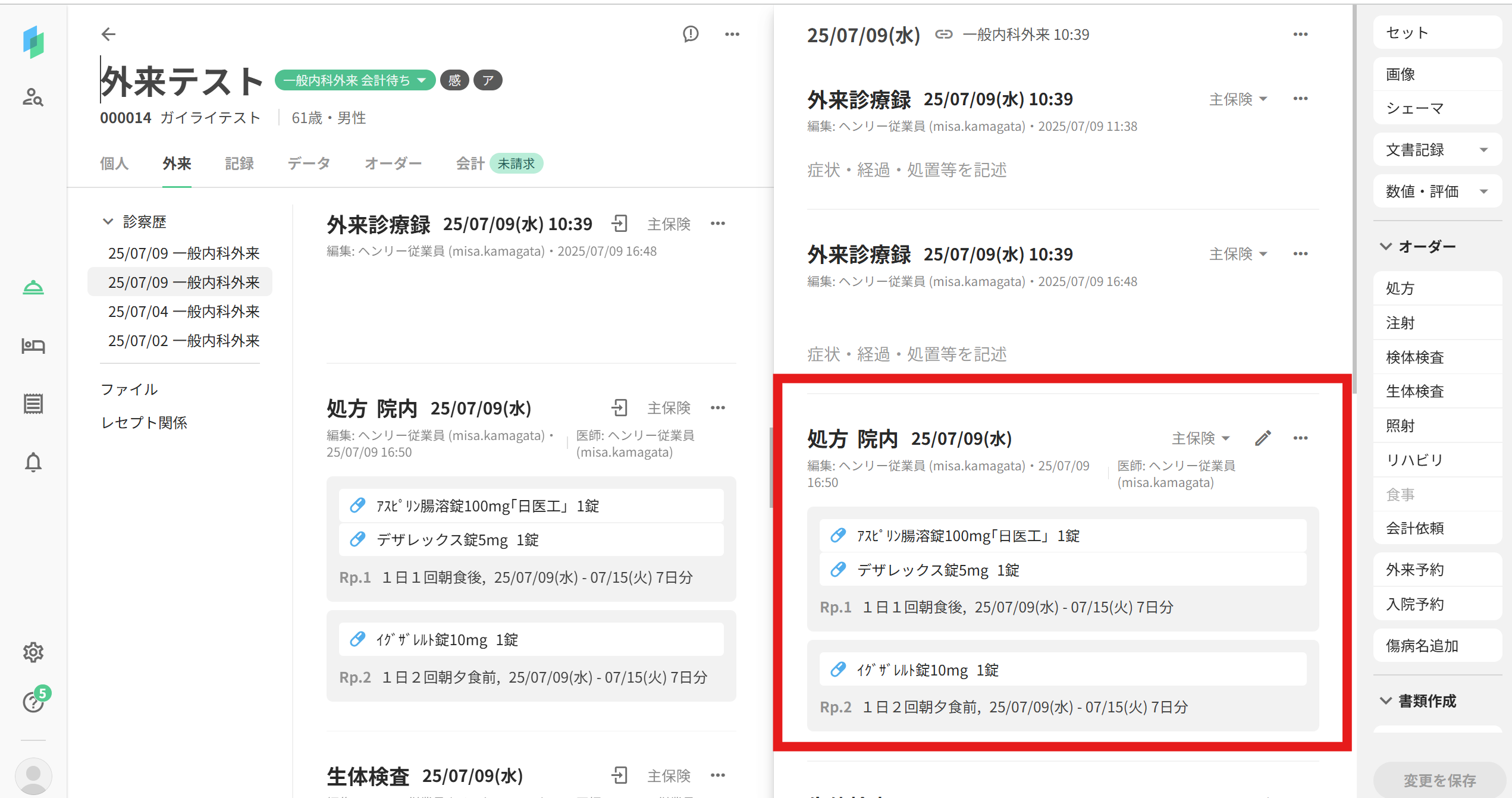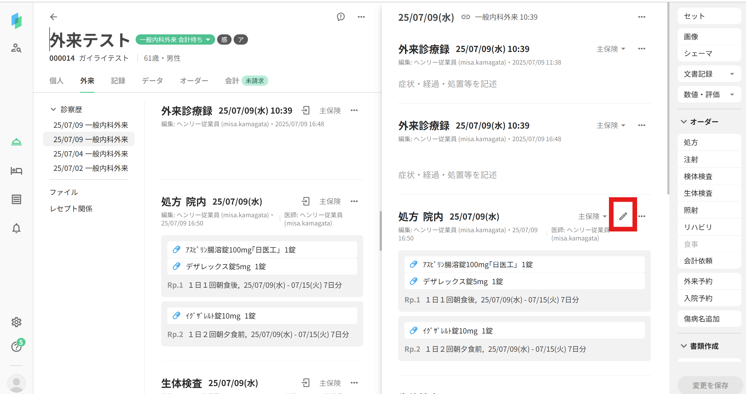 想定される状況医師の作成した処方オーダーを看護師、薬剤師、医事課などで変更したい対処方法当該患者様の外来カルテを開きます画面右側に、外来カルテの編集画面が開きますので、編集したい処方オーダーを探します処方オーダーの右上にある、ペンマークを押下します処方オーダーの編集画面が開きますので、内容を変更し、右下の「完了」を押下してくださいカルテ画面に戻りますので、右下の「変更を保存」を押下してください