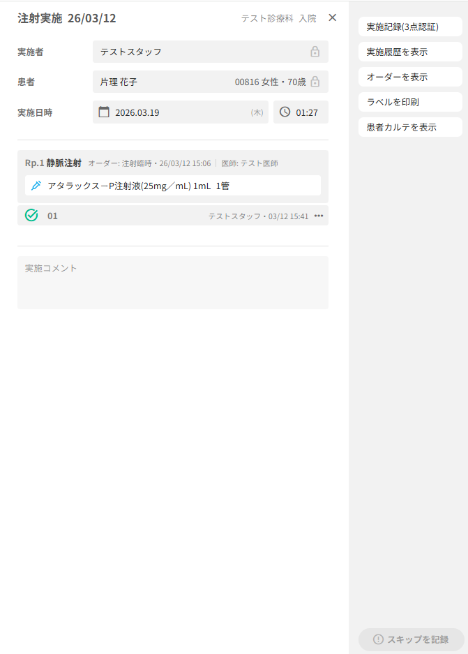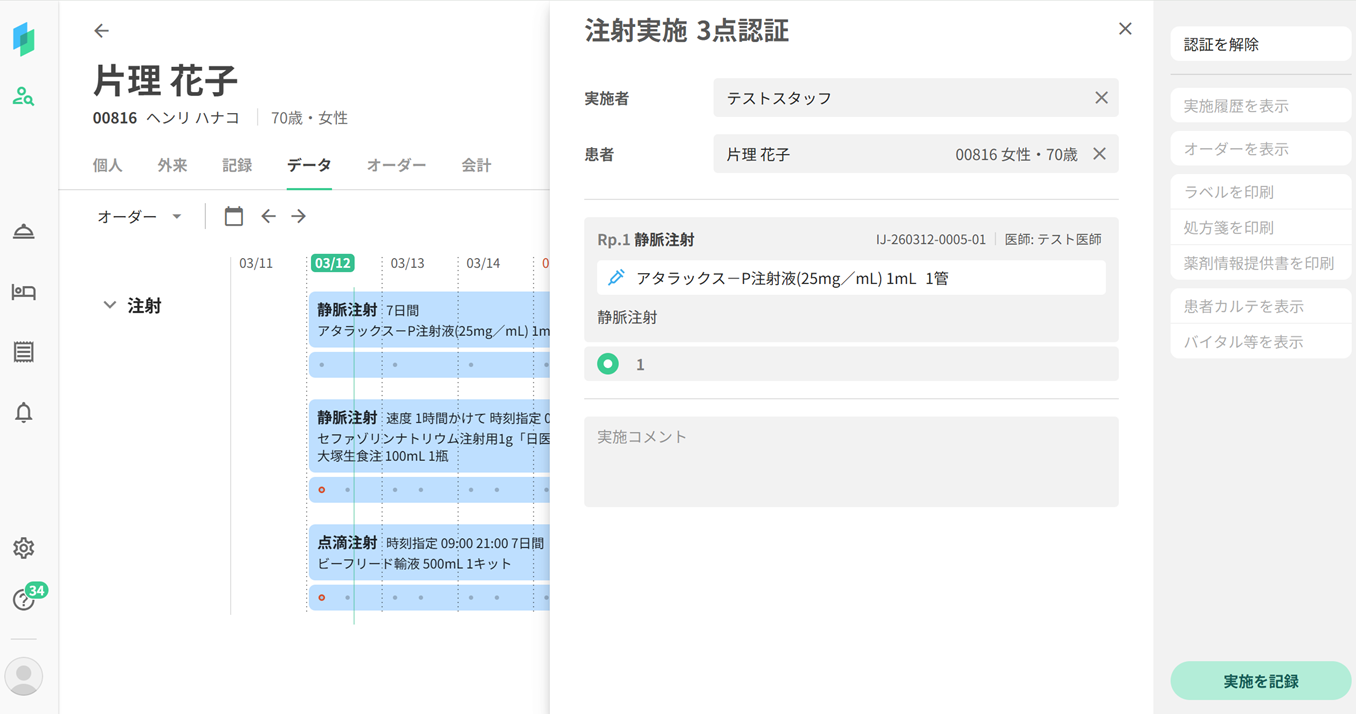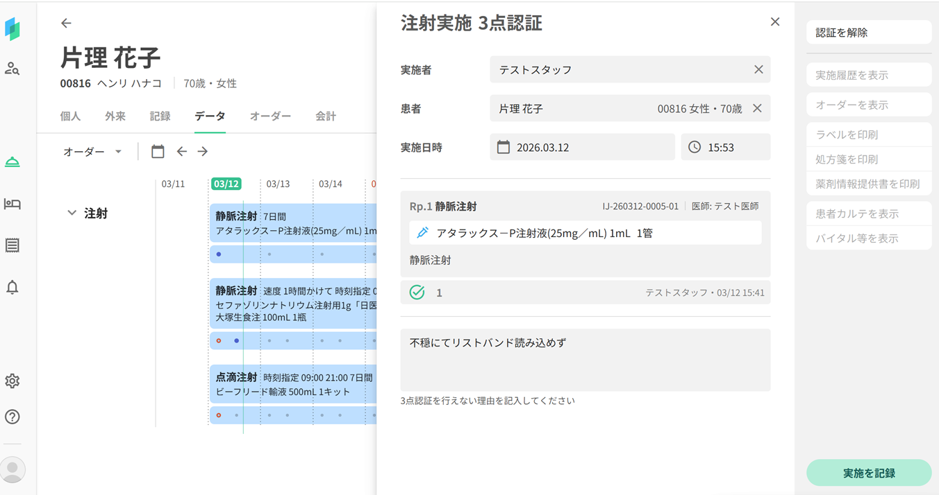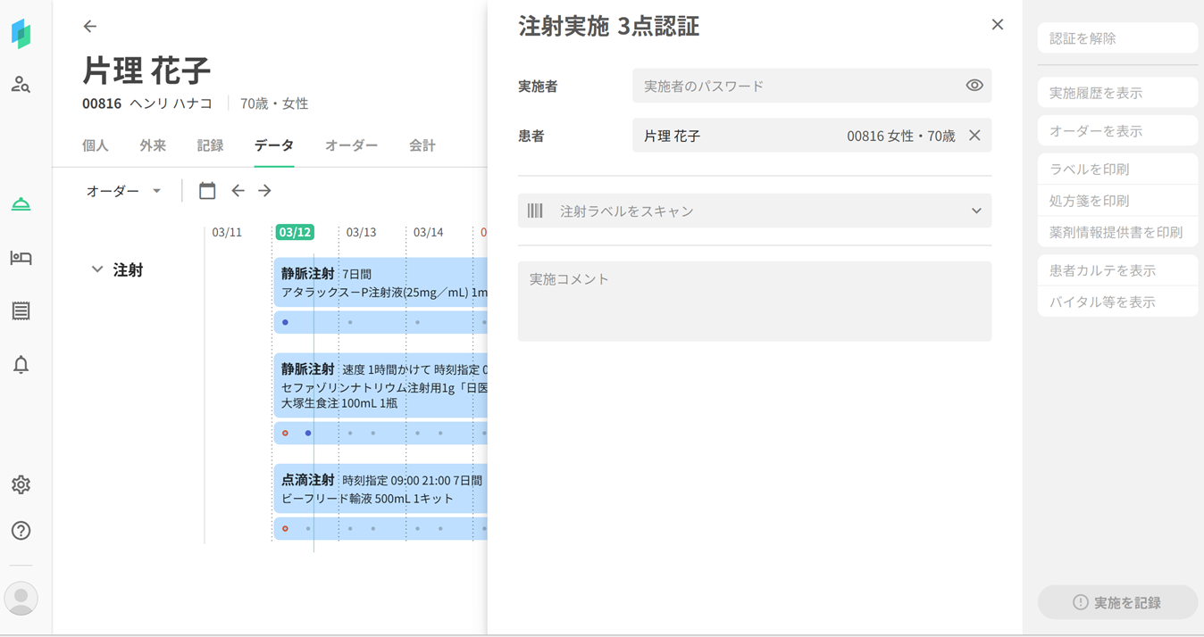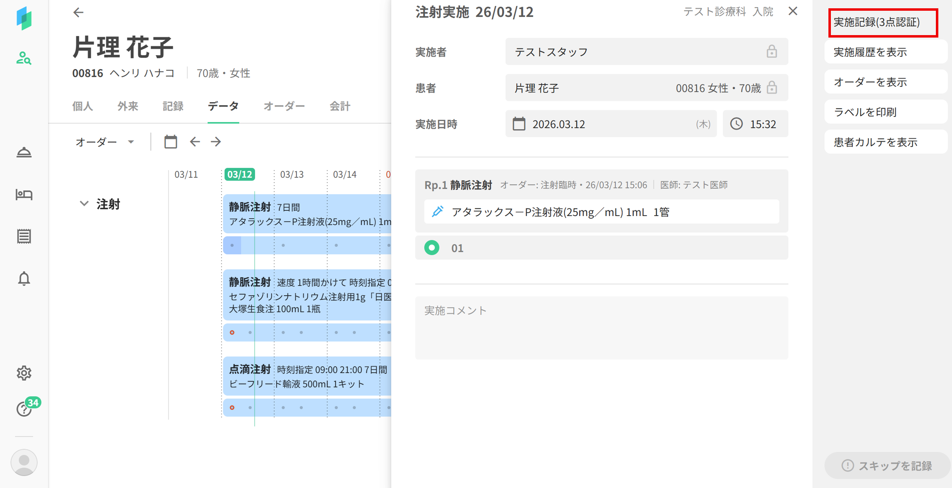 2.アクションパネルの最上部[実施記録(3点認証)]をクリックします。クリックすると「注射実施 3点認証」画面が開きます。