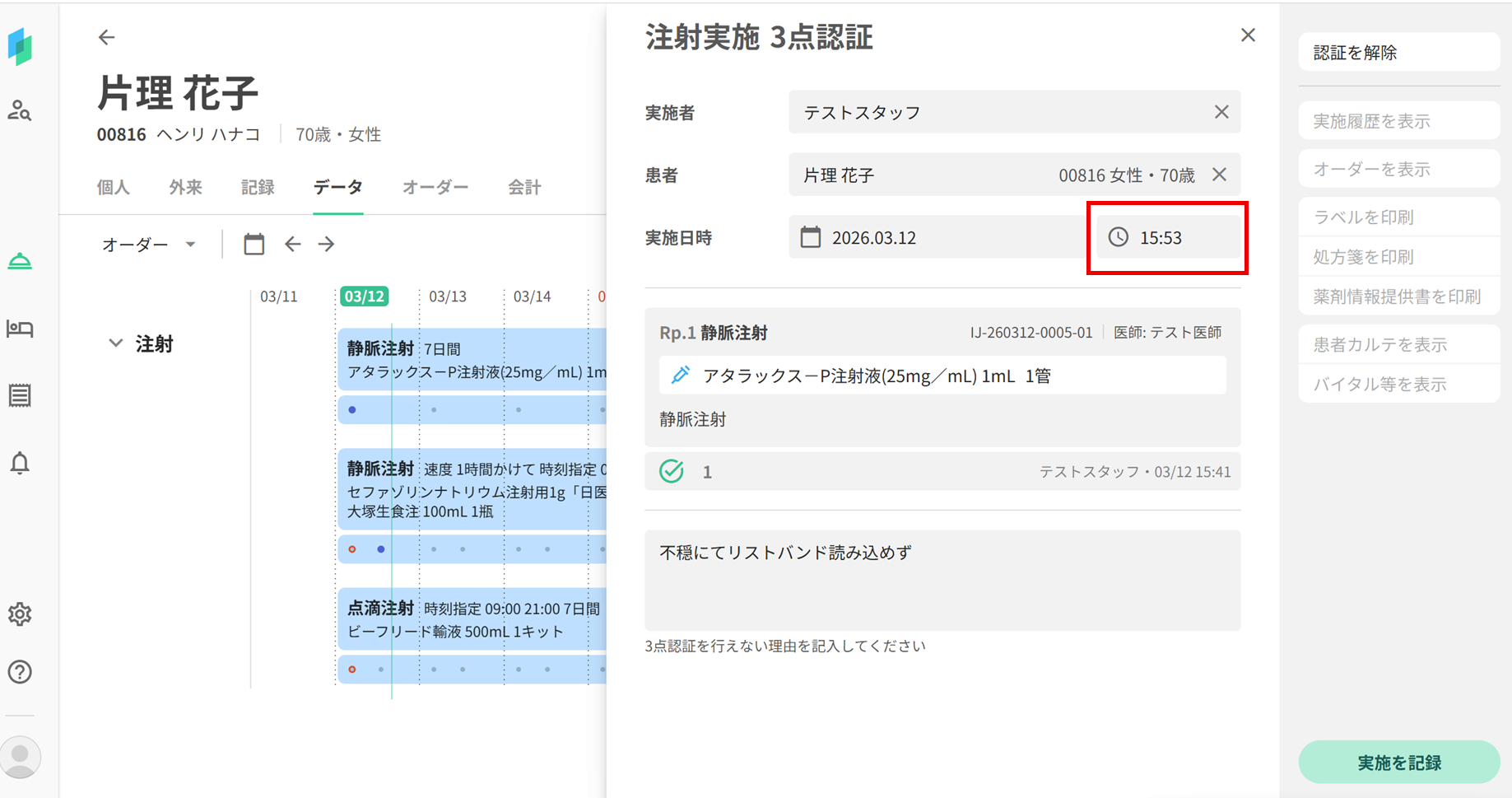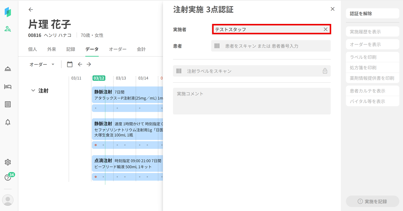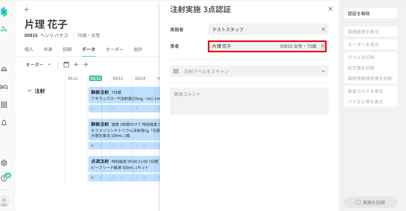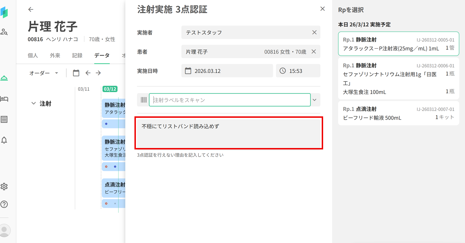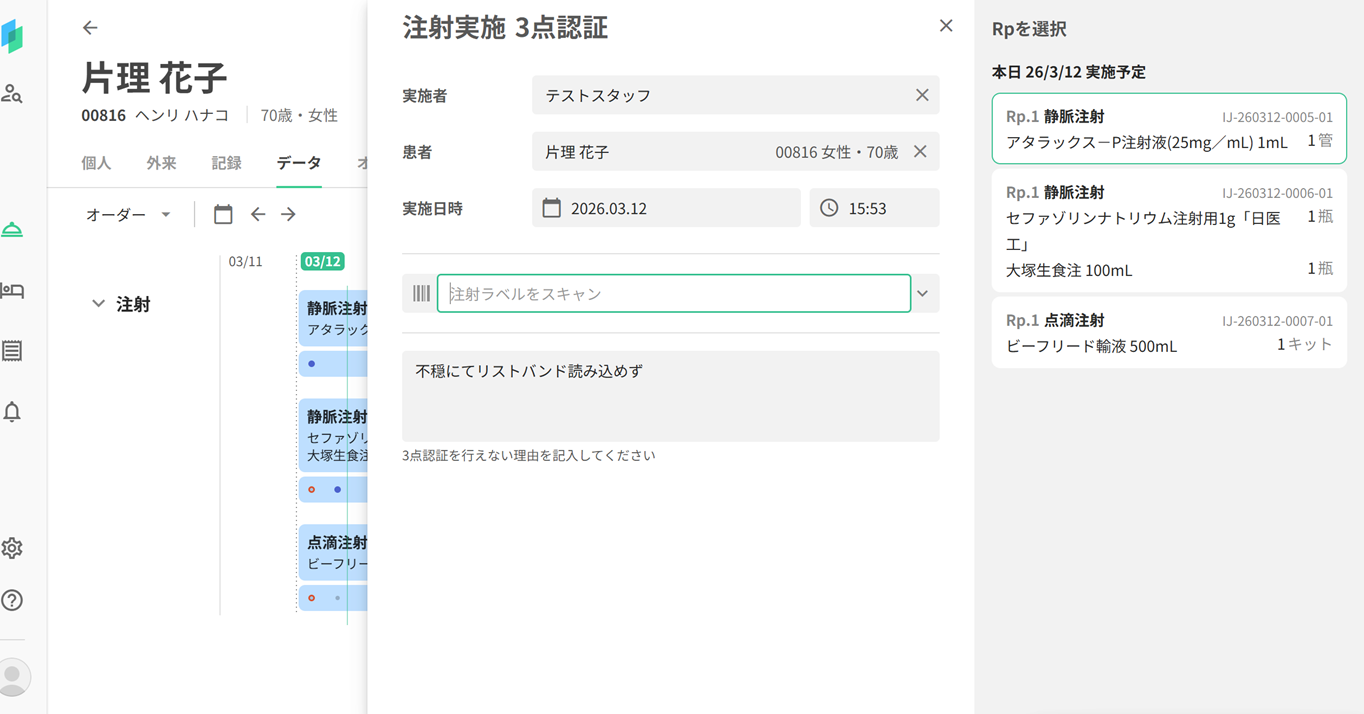 スキャンした患者の[注射実施 3点認証]画面が開き、[患者]の欄には当該患者の氏名が自動で入力されます。