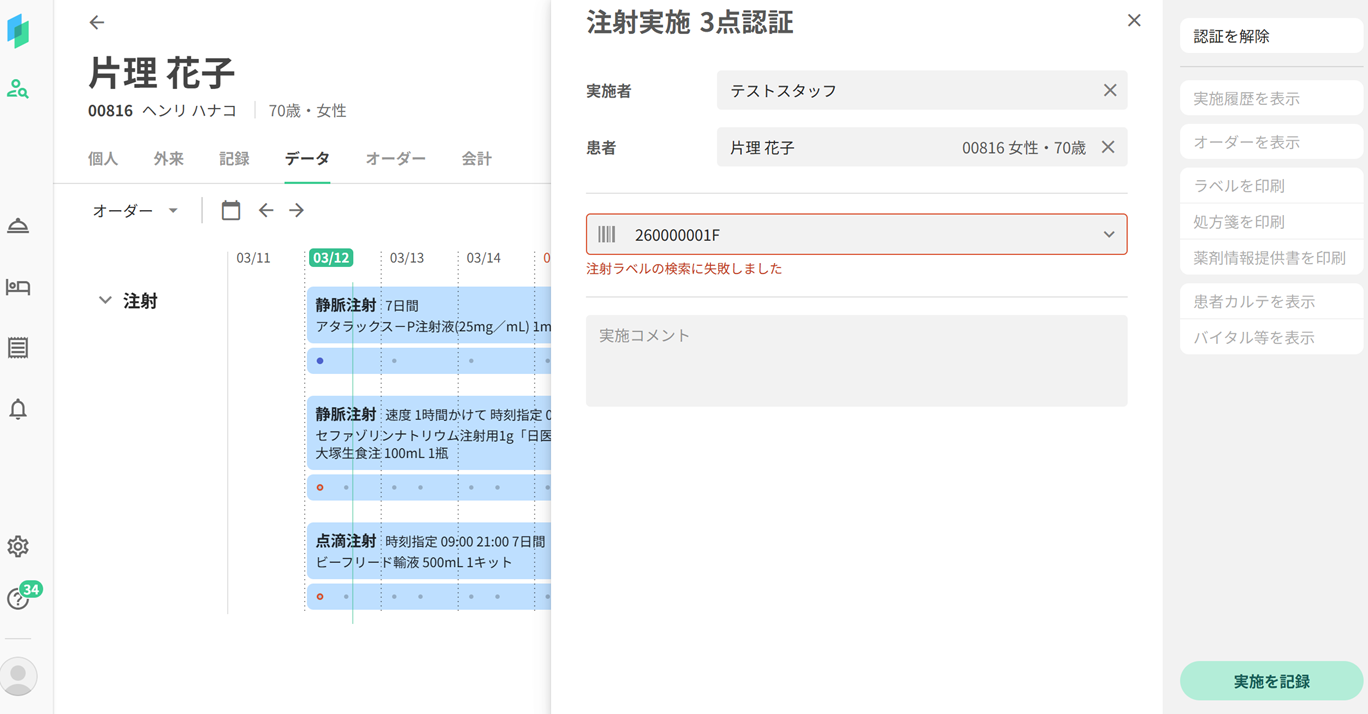 薬剤ラベルと最新のオーダー情報が異なる または薬剤と患者が一致しない場合、エラーが表示されます