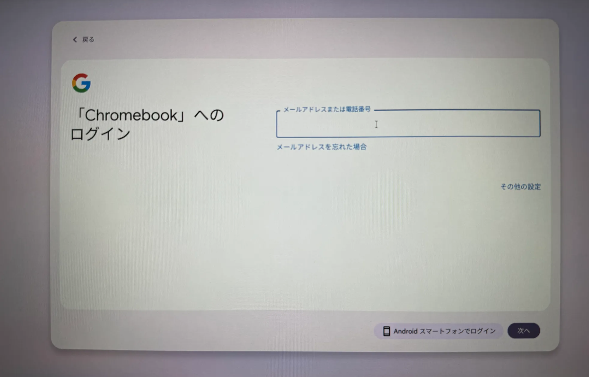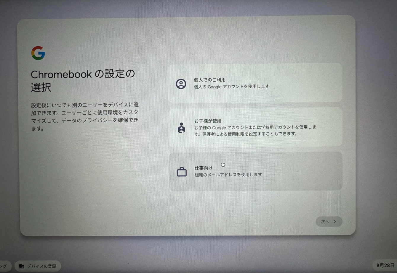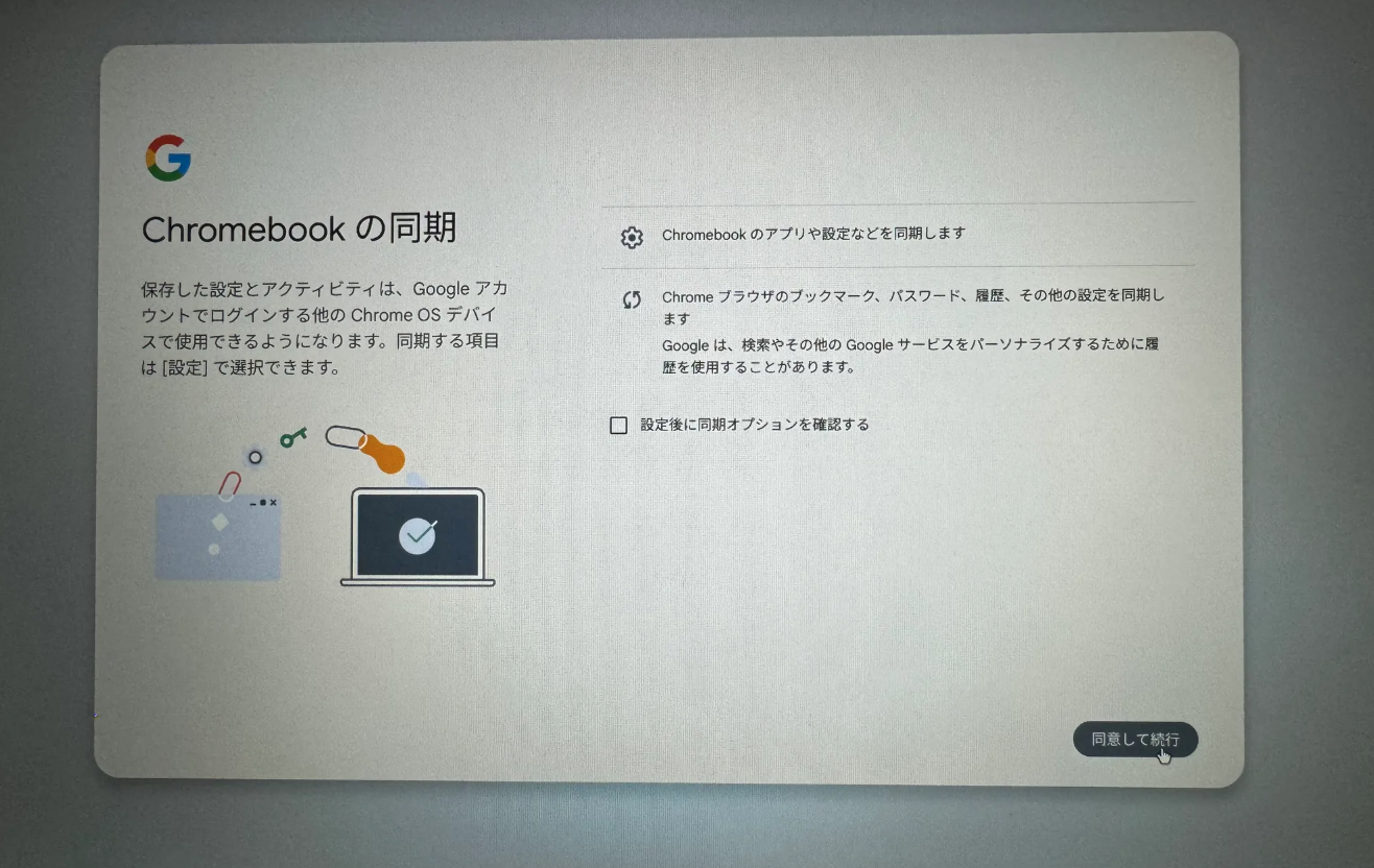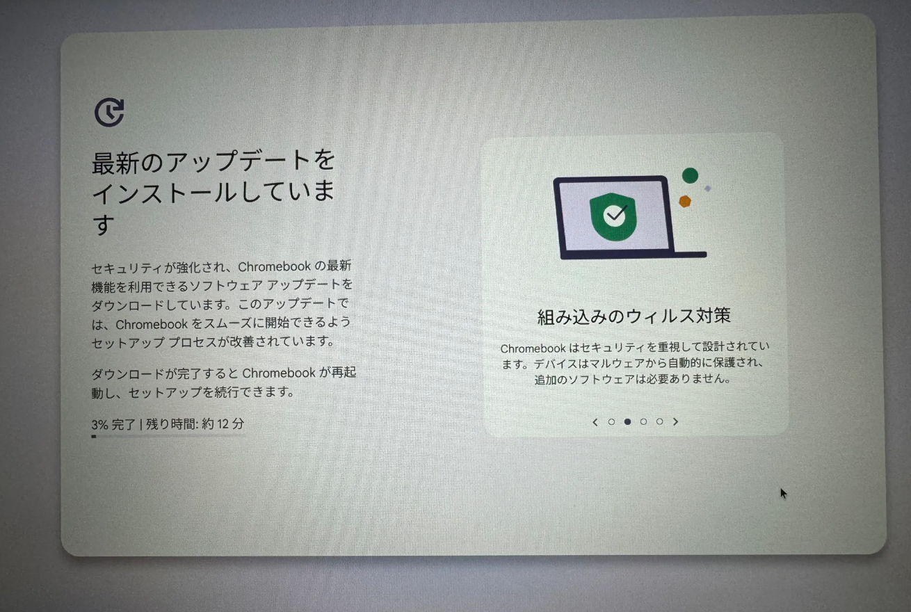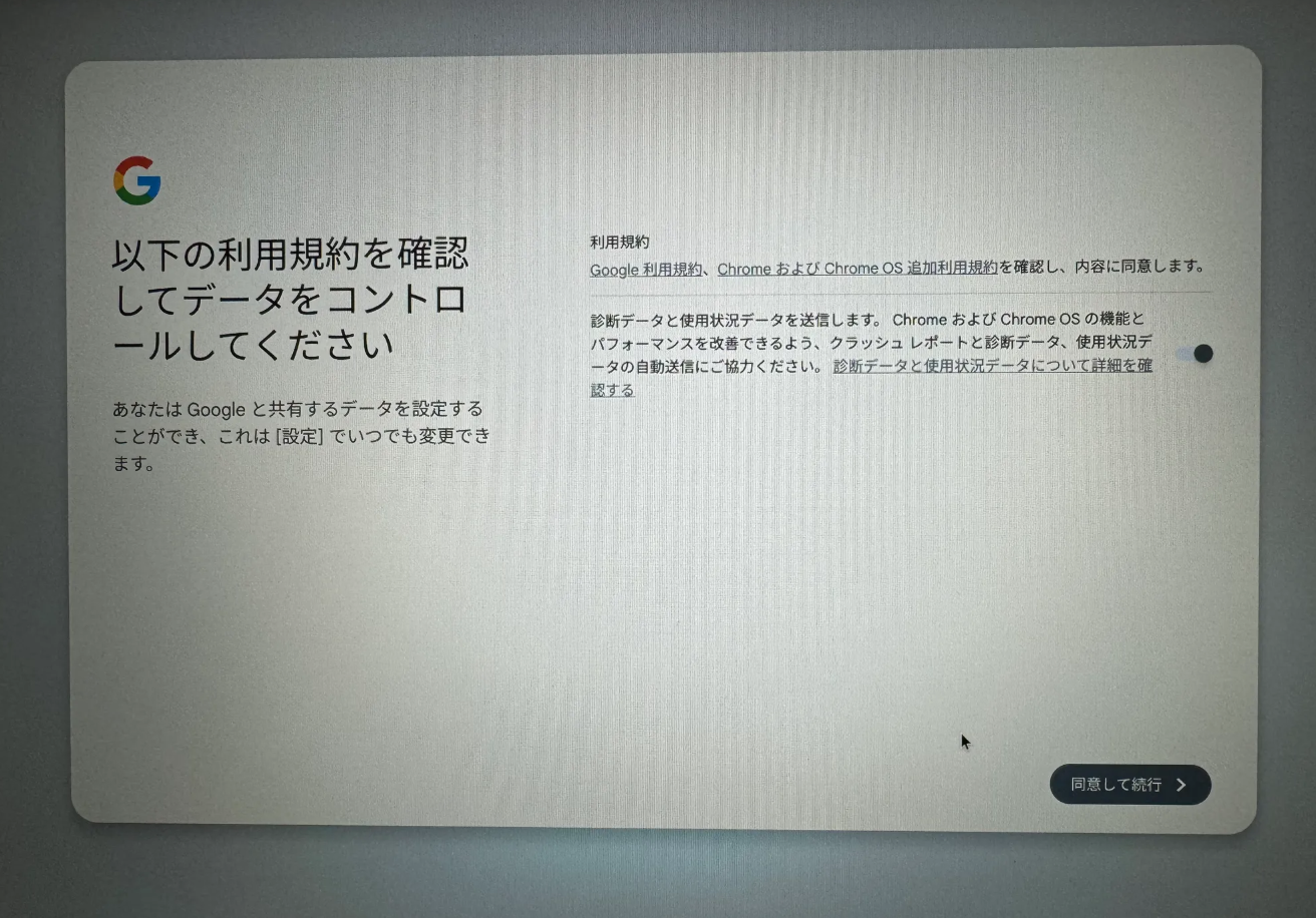 ChromeOSのバージョンによって多少画面が異なる可能性がございます。画面や文言等が異なる場合がありますが、基本的にやって頂く事は変わりません。