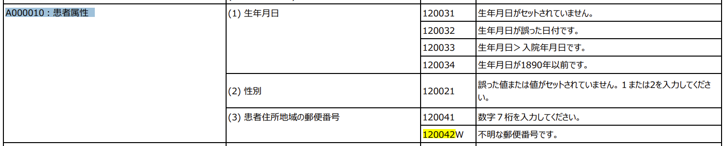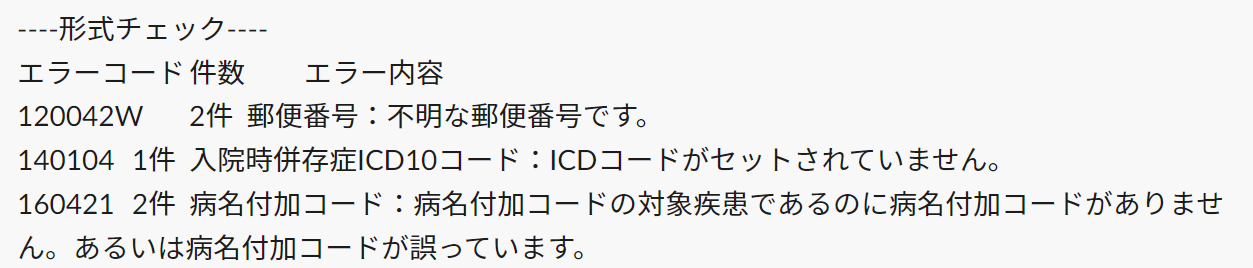 相関チェックのエラー一覧はエラーの種類毎に最大100行表示されますが、当該エラーの場所(行数)は表示されませんので、院内確認用データ出力先に出力された「エラー確認用データ」で詳細な行数を確認・特定してください。