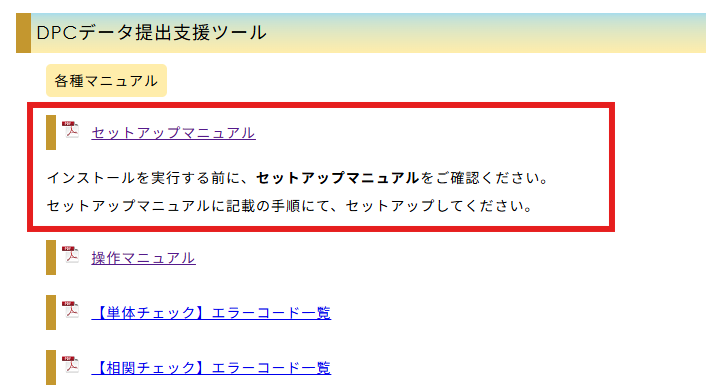 ※マニュアル確認場所 :ツール内のドキュメント(画像参照)またはDPCデータ提出支援ツールの各種マニュアル