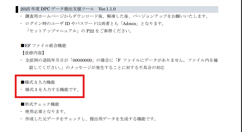 (参考ページ:2025 年度 DPC データ提出支援ツール(形式チェック機能・様式 3 入力機能)の掲載について)