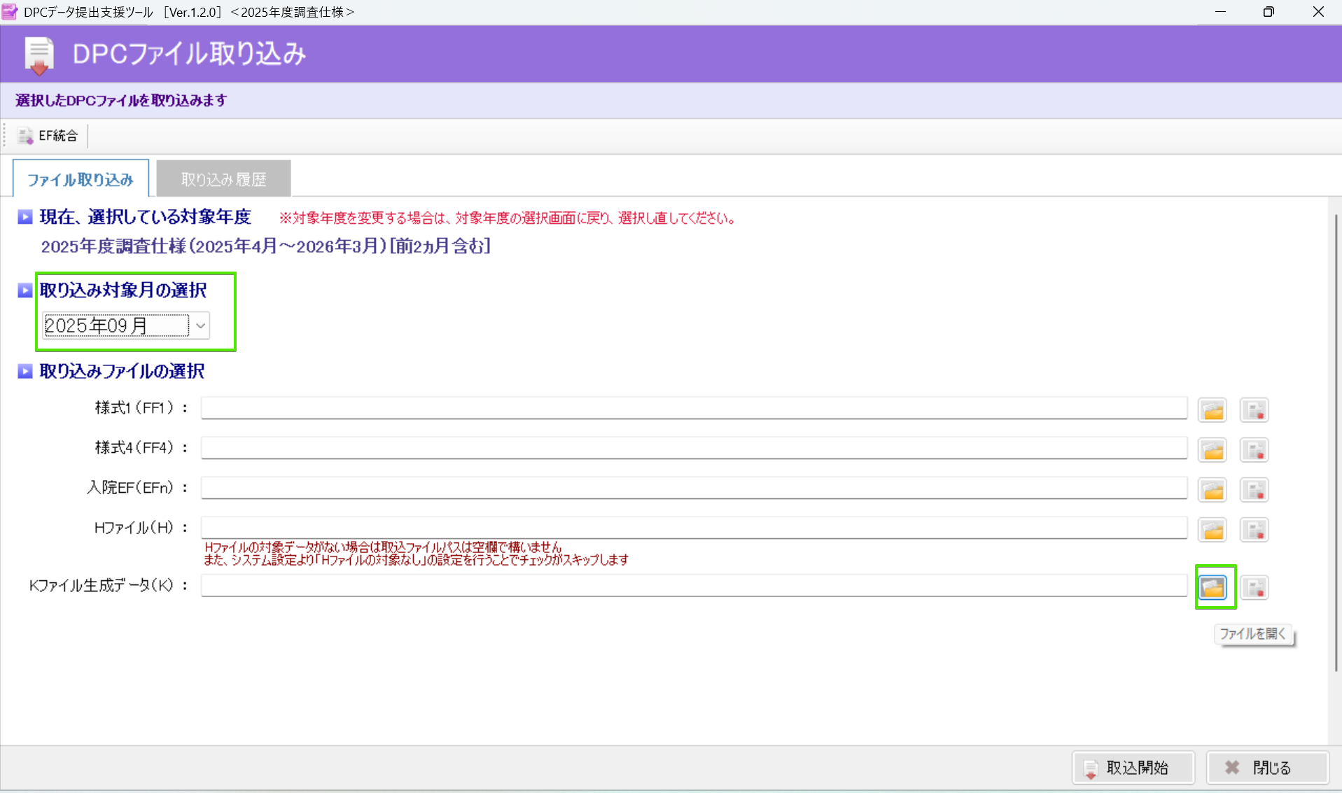 Henryから出力する「Kファイル生成用データ」をDPC提出支援ツールの「ファイル取り込み」>「Kファイル生成データ」に読み込ませて作成する。