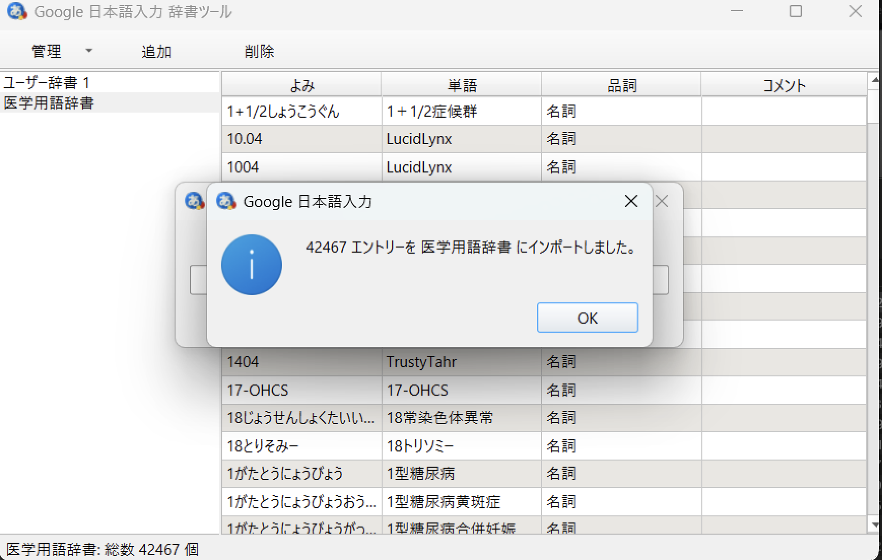 辞書名を「医学用語辞書」など任意の名前を入力し、インポートを押します。