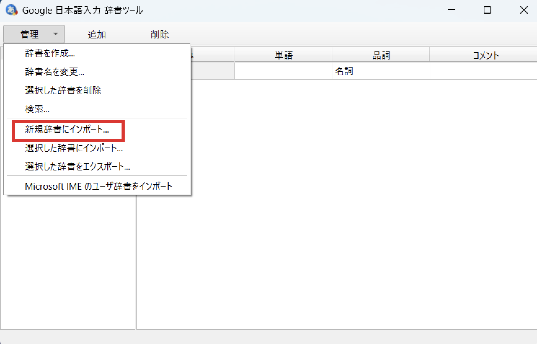 左上の管理より、「新規辞書にインポート」をクリック