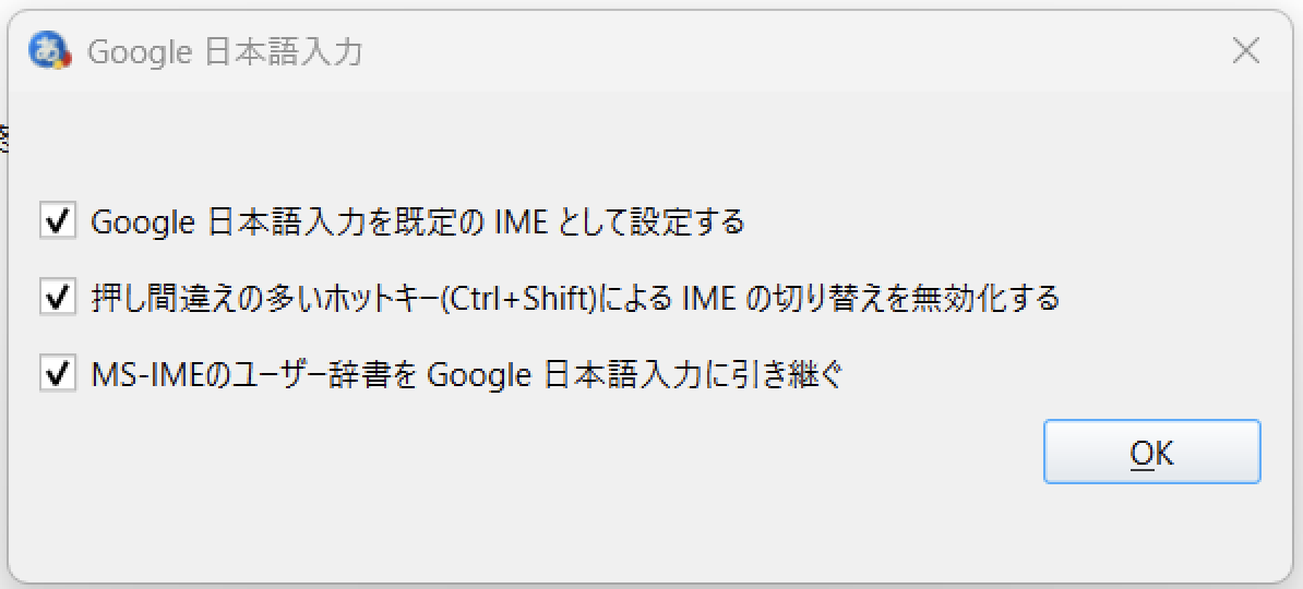MS-IMEのユーザー辞書を引き継ぐ: これにチェックを入れると、これまでMicrosoft IMEで登録していた単語をGoogle 日本語入力でも使えるようになります。