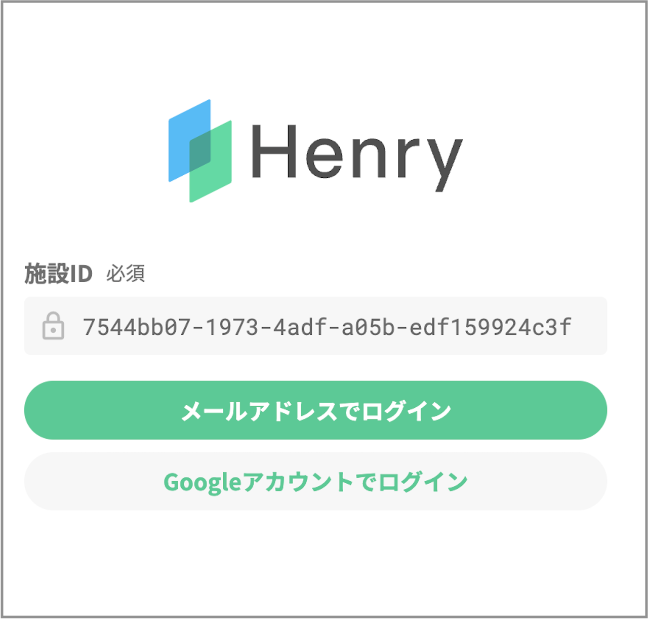 https://henry-app.jp/ より、「施設ID」に各医療機関の施設IDを入力します。 「メールアドレスでログイン」、または「Googleアカウントでログイン」を選択します。