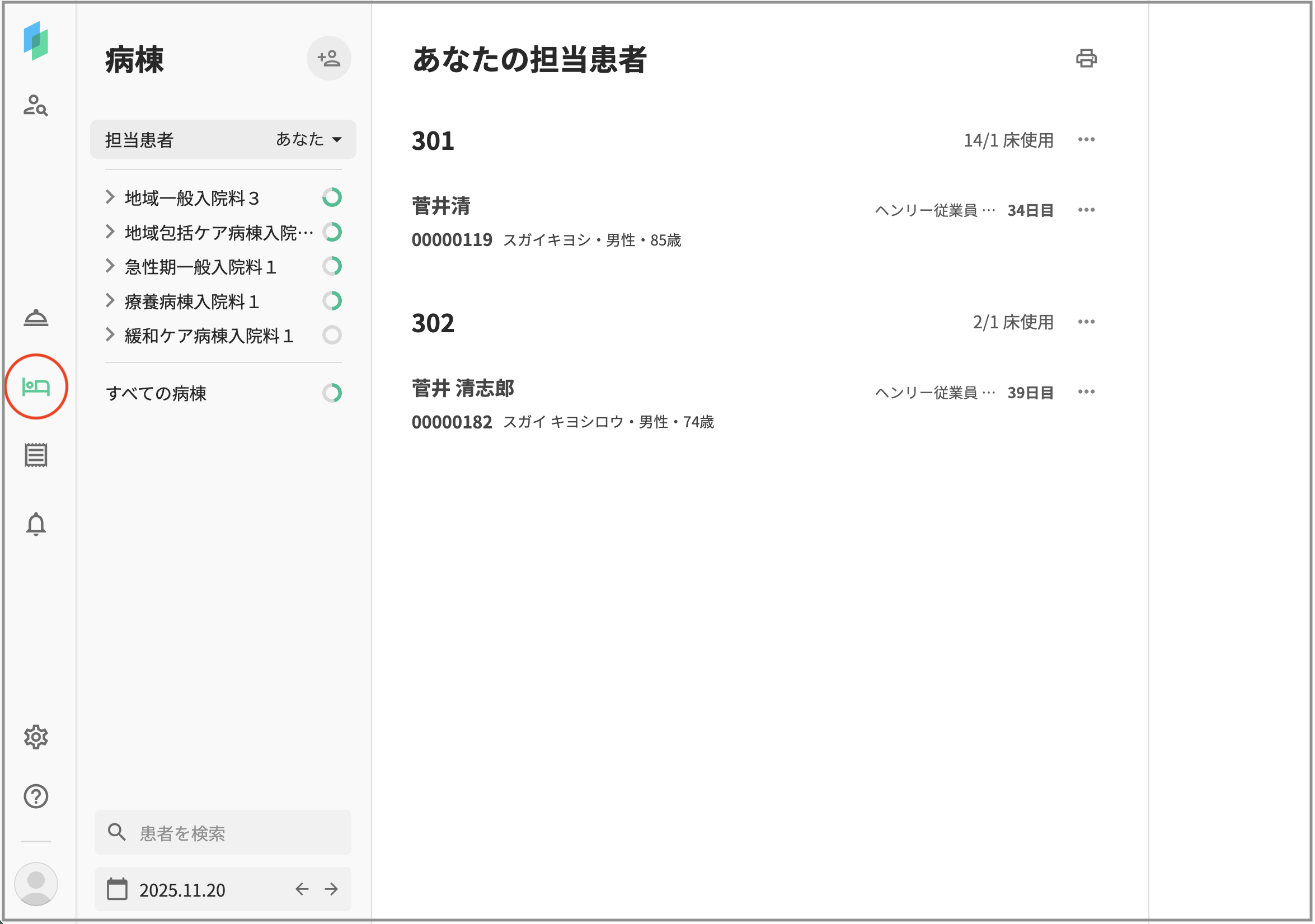 例)ログイン後「病棟」ページを開く