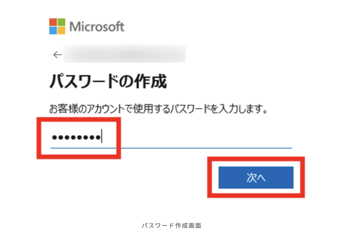 次にMicrosoftアカウントで使用するパスワードを設定し、「次へ」を選択する。
