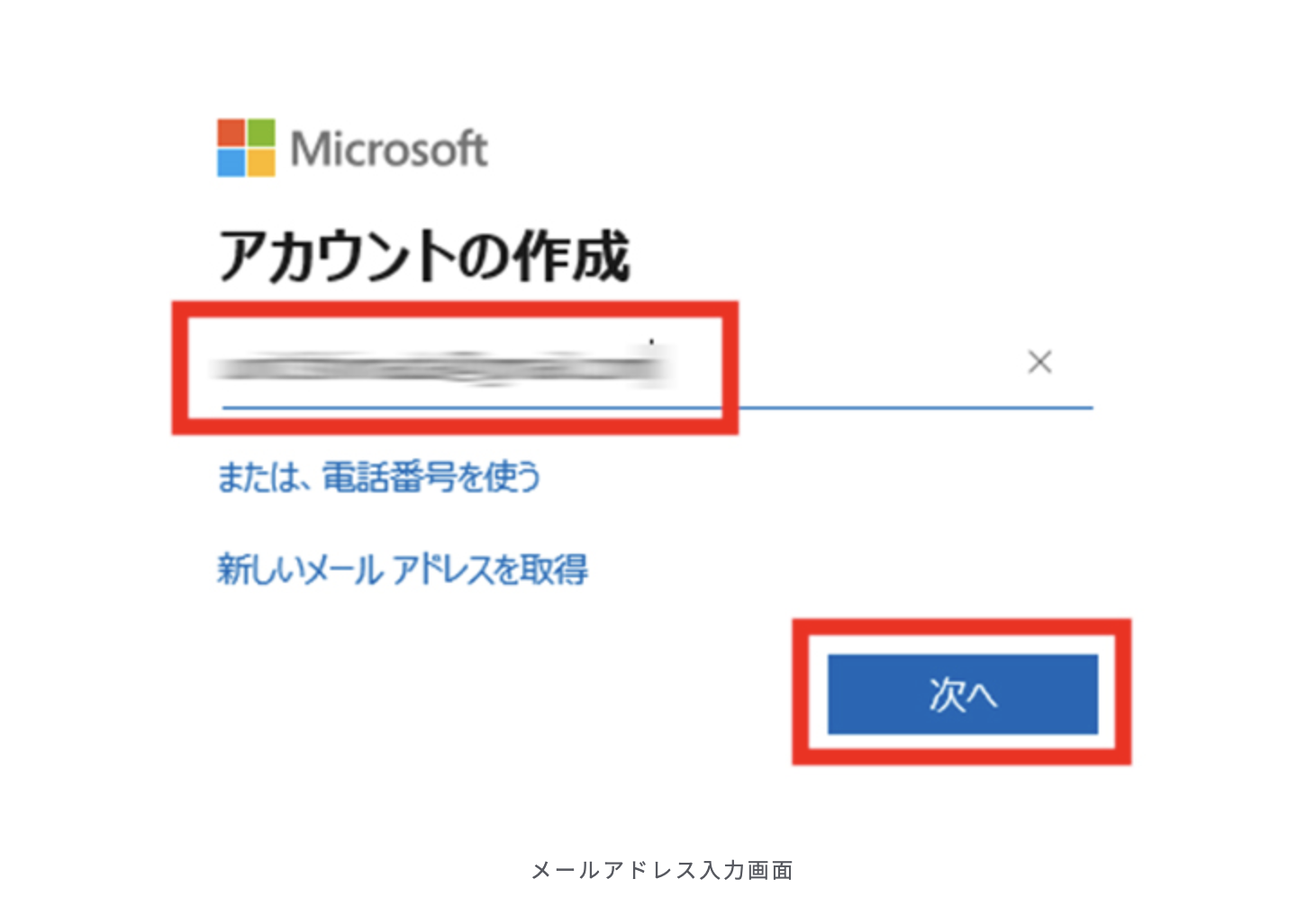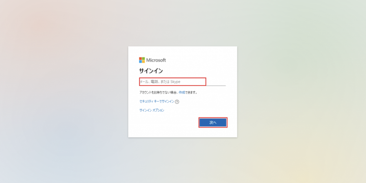 Microsoft アカウントのメールアドレスを入力して、「次へ」をクリックする。