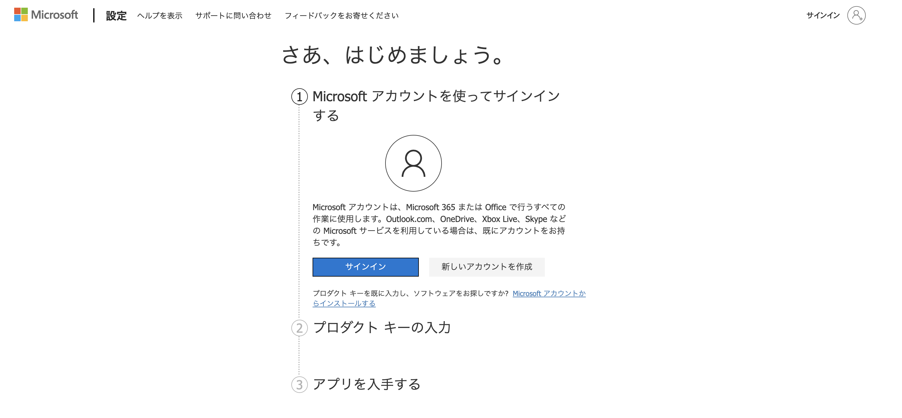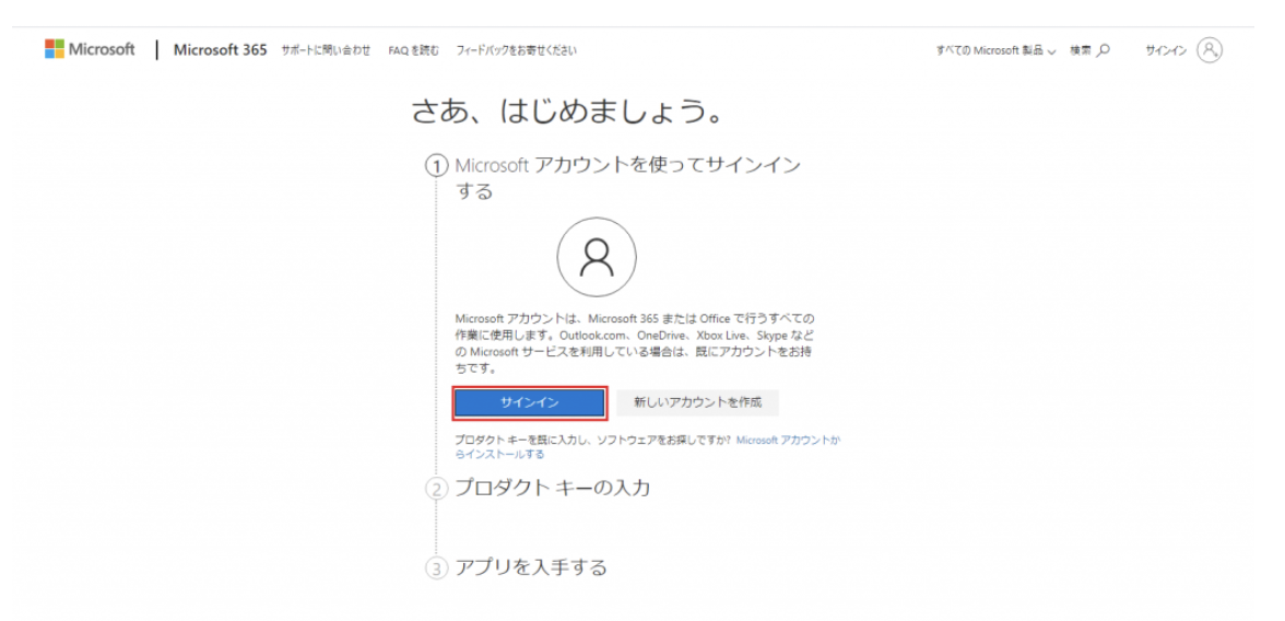 はじめに「Microsoft 公式ダウンロードページ」をクリックして、Microsoft Office のダウンロード ページにアクセスしましょう。