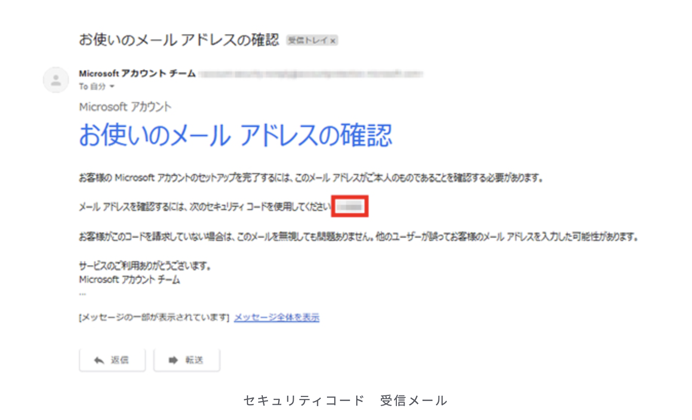 パスワードの作成で「次へ」をクリックすると、「アカウントの作成」で入力したメールアドレス宛にセキュリティコードが送信される。