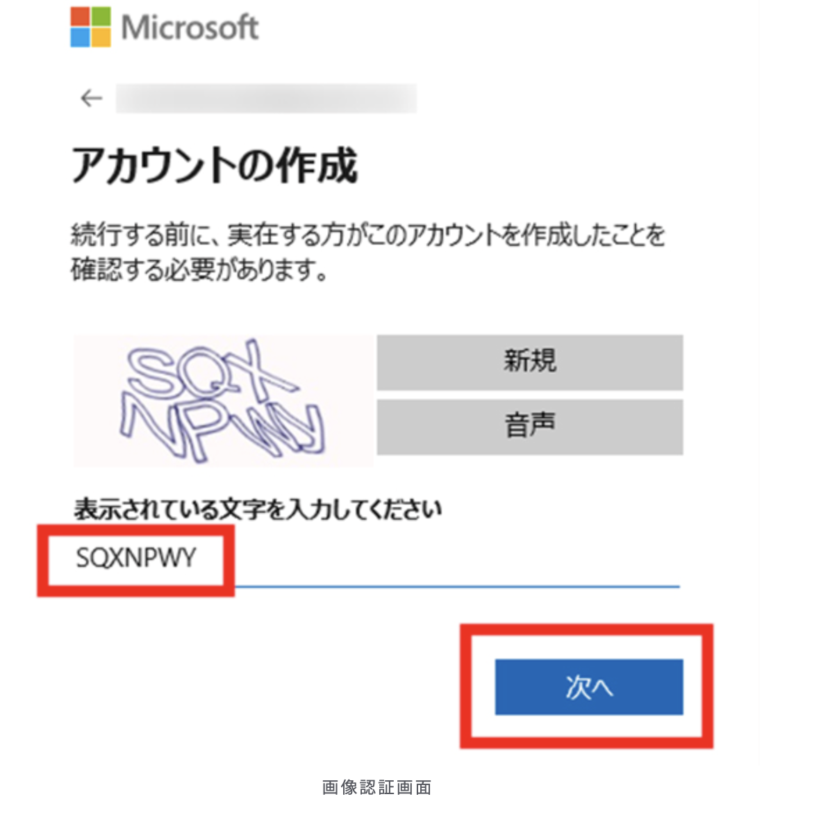 画像認証の画面が表示されますので、画像に表示されている文字を入力して「次へ」を選択する。